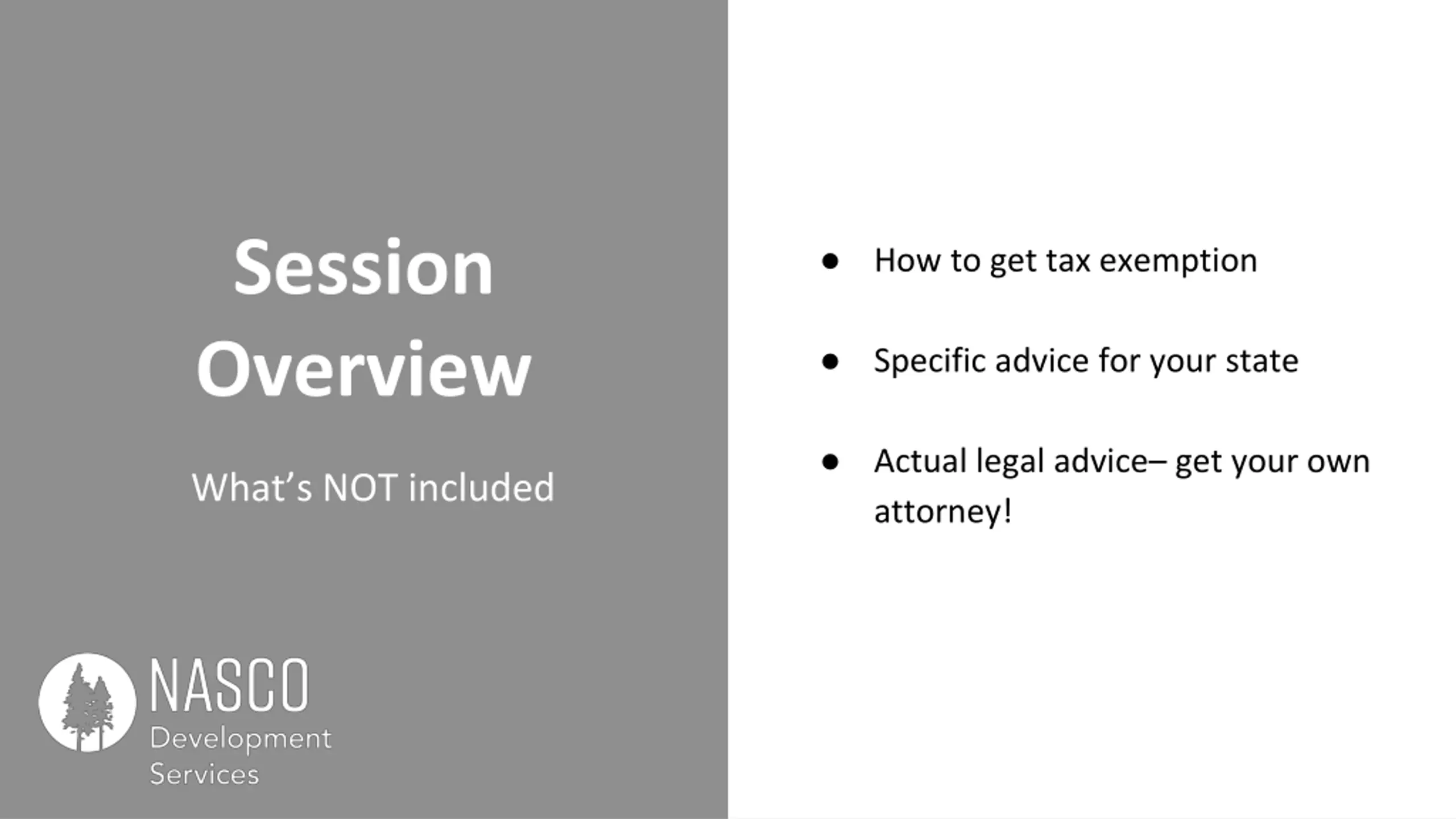 Session Overview How to get tax exemption Specific advice for your state Actual legal advice get your own attorney! What s NOT included