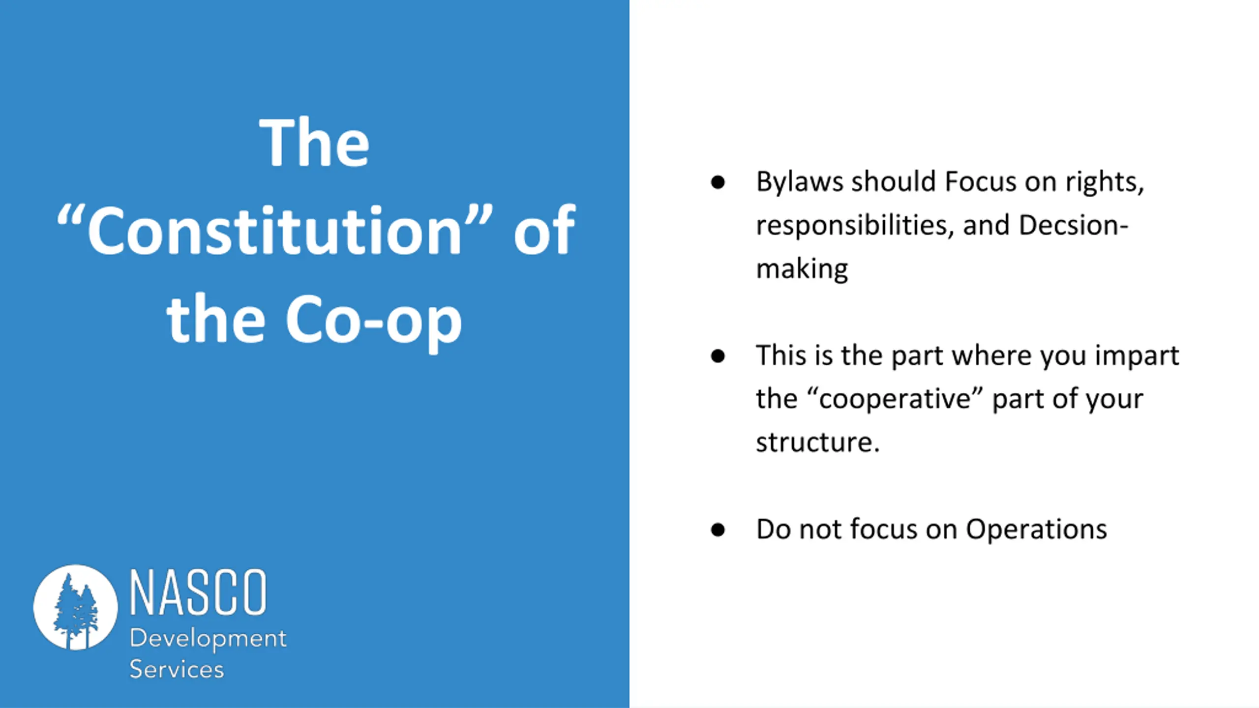 The Bylaws should Focus on rights, responsibilities, and Decsion- making Constitution of the Co-op This is the part where you impart the cooperative part of your structure. Do not focus on Operations