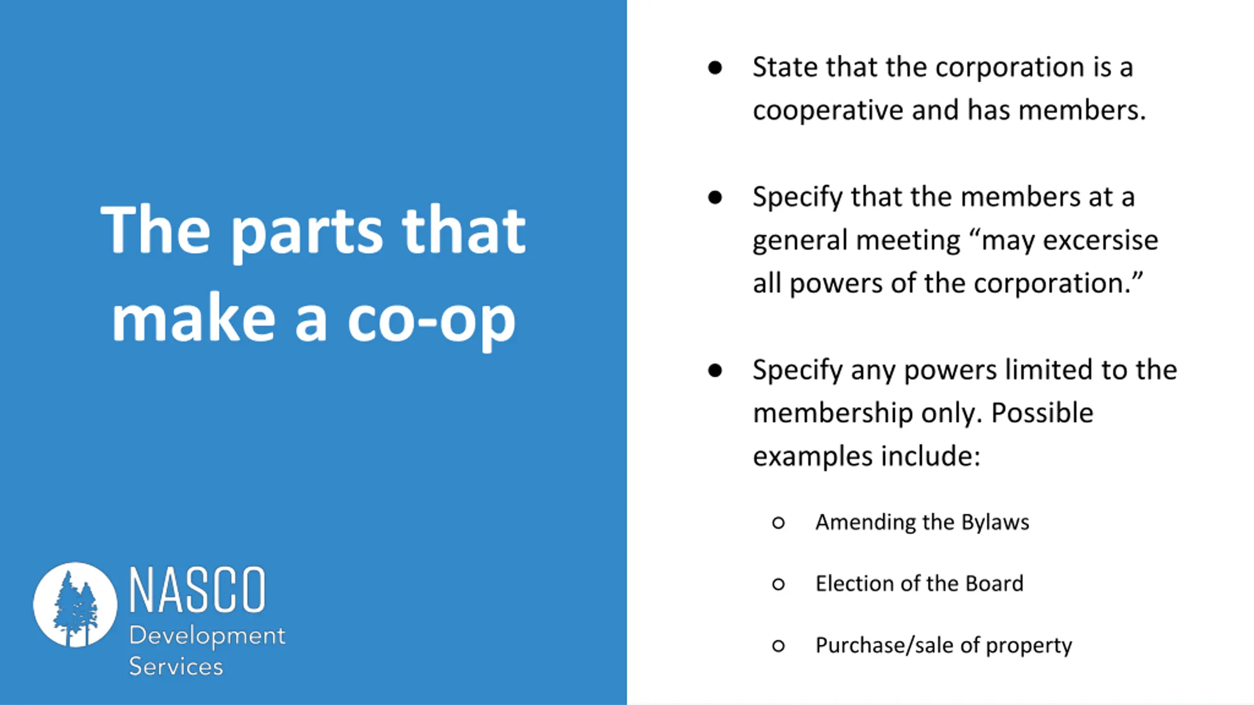 State that the corporation is a cooperative and has members. Specify that the members at a general meeting may excersise all powers of the corporation. The parts that make a co-op Specify any powers limited to the membership only. Possible examples include: Amending the Bylaws Election of the Board Purchase/sale of property