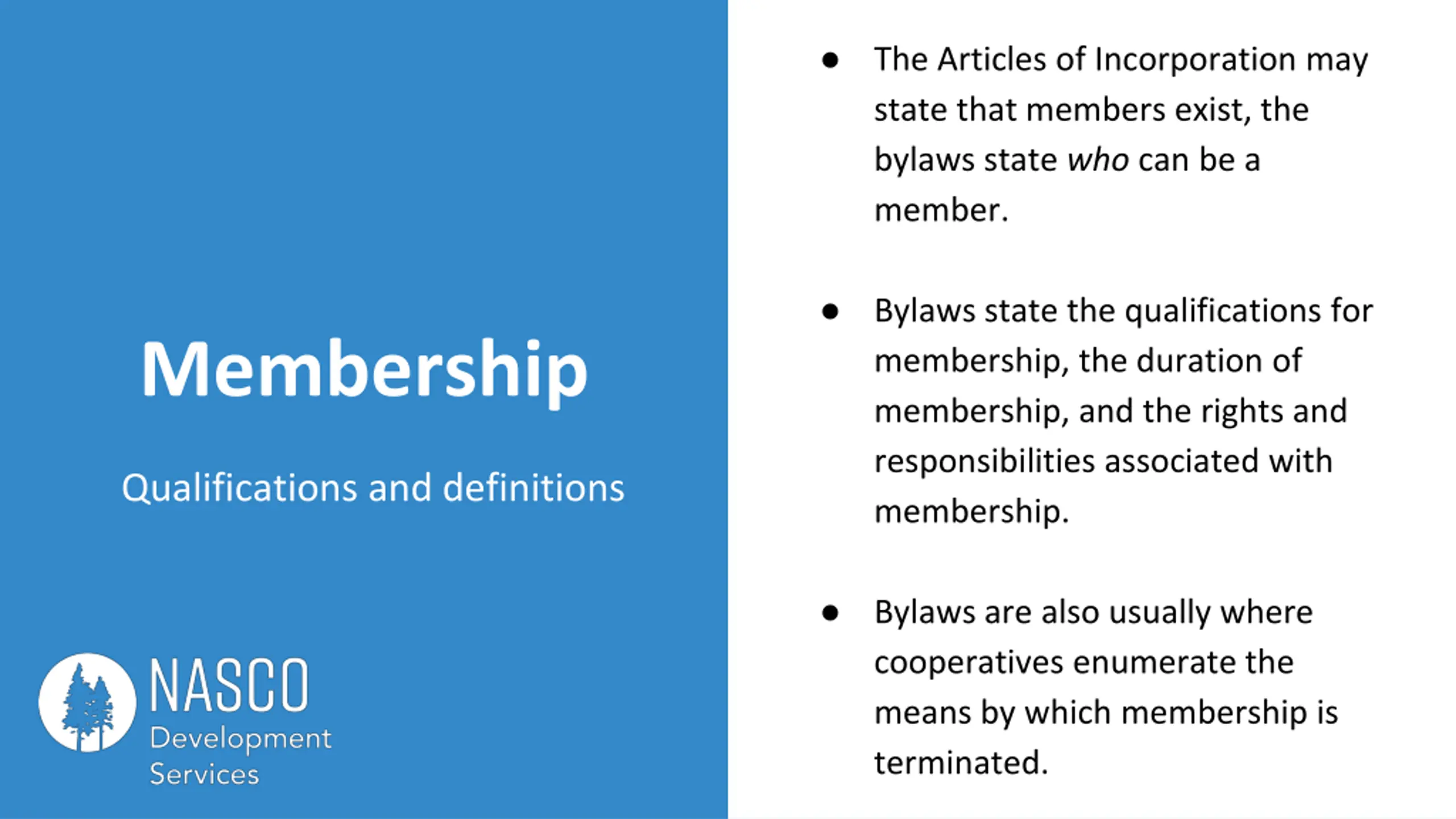 The Articles of Incorporation may state that members exist, the bylaws state who can be a member. Bylaws state the qualifications for membership, the duration of membership, and the rights and responsibilities associated with membership. Membership Qualifications and definitions Bylaws are also usually where cooperatives enumerate the means by which membership is terminated.