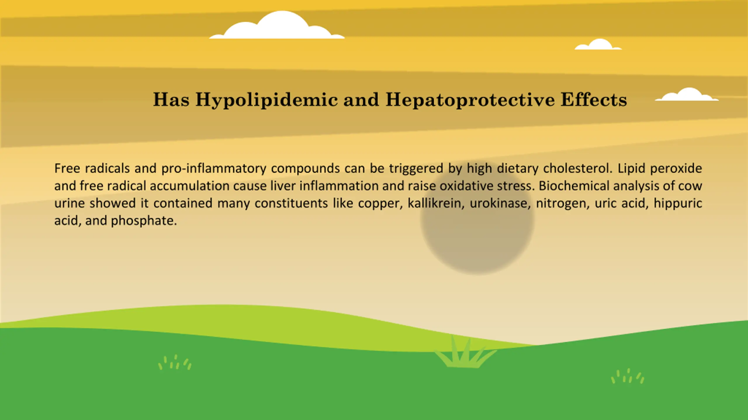 Has Hypolipidemic and Hepatoprotective Effects Free radicals and pro-inflammatory compounds can be triggered by high dietary cholesterol. Lipid peroxide and free radical accumulation cause liver inflammation and raise oxidative stress. Biochemical analysis of cow urine showed it contained many constituents like copper, kallikrein, urokinase, nitrogen, uric acid, hippuric acid, and phosphate.