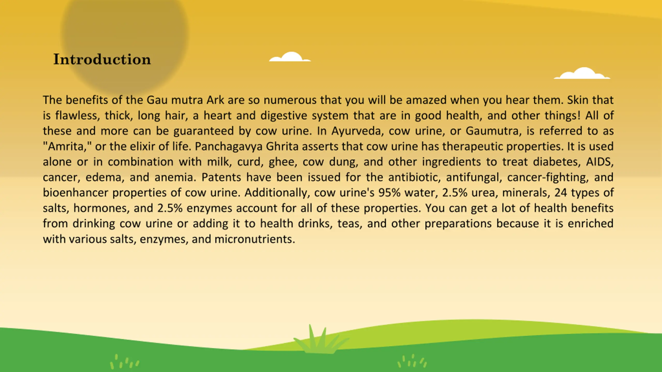 Introduction The benefits of the Gau mutra Ark are so numerous that you will be amazed when you hear them. Skin that is flawless, thick, long hair, a heart and digestive system that are in good health, and other things! All of these and more can be guaranteed by cow urine. In Ayurveda, cow urine, or Gaumutra, is referred to as "Amrita," or the elixir of life. Panchagavya Ghrita asserts that cow urine has therapeutic properties. It is used alone or in combination with milk, curd, ghee, cow dung, and other ingredients to treat diabetes, AIDS, cancer, edema, and anemia. Patents have been issued for the antibiotic, antifungal, cancer-fighting, and bioenhancer properties of cow urine. Additionally, cow urine's 95% water, 2.5% urea, minerals, 24 types of salts, hormones, and 2.5% enzymes account for all of these properties. You can get a lot of health benefits from drinking cow urine or adding it to health drinks, teas, and other preparations because it is enriched with various salts, enzymes, and micronutrients.