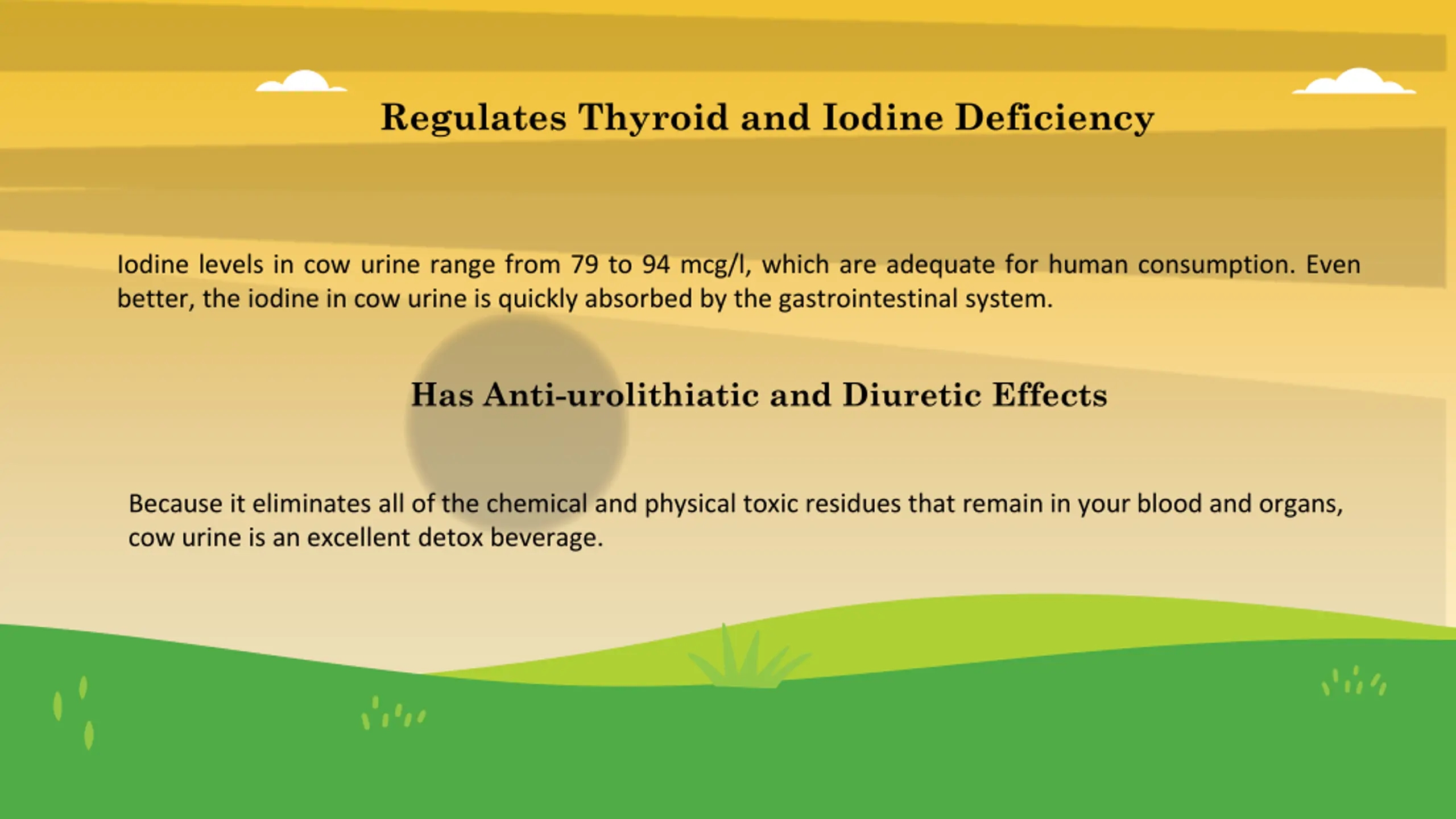 Regulates Thyroid and Iodine Deficiency Iodine levels in cow urine range from 79 to 94 mcg/l, which are adequate for human consumption. Even better, the iodine in cow urine is quickly absorbed by the gastrointestinal system. Has Anti-urolithiatic and Diuretic Effects Because it eliminates all of the chemical and physical toxic residues that remain in your blood and organs, cow urine is an excellent detox beverage.