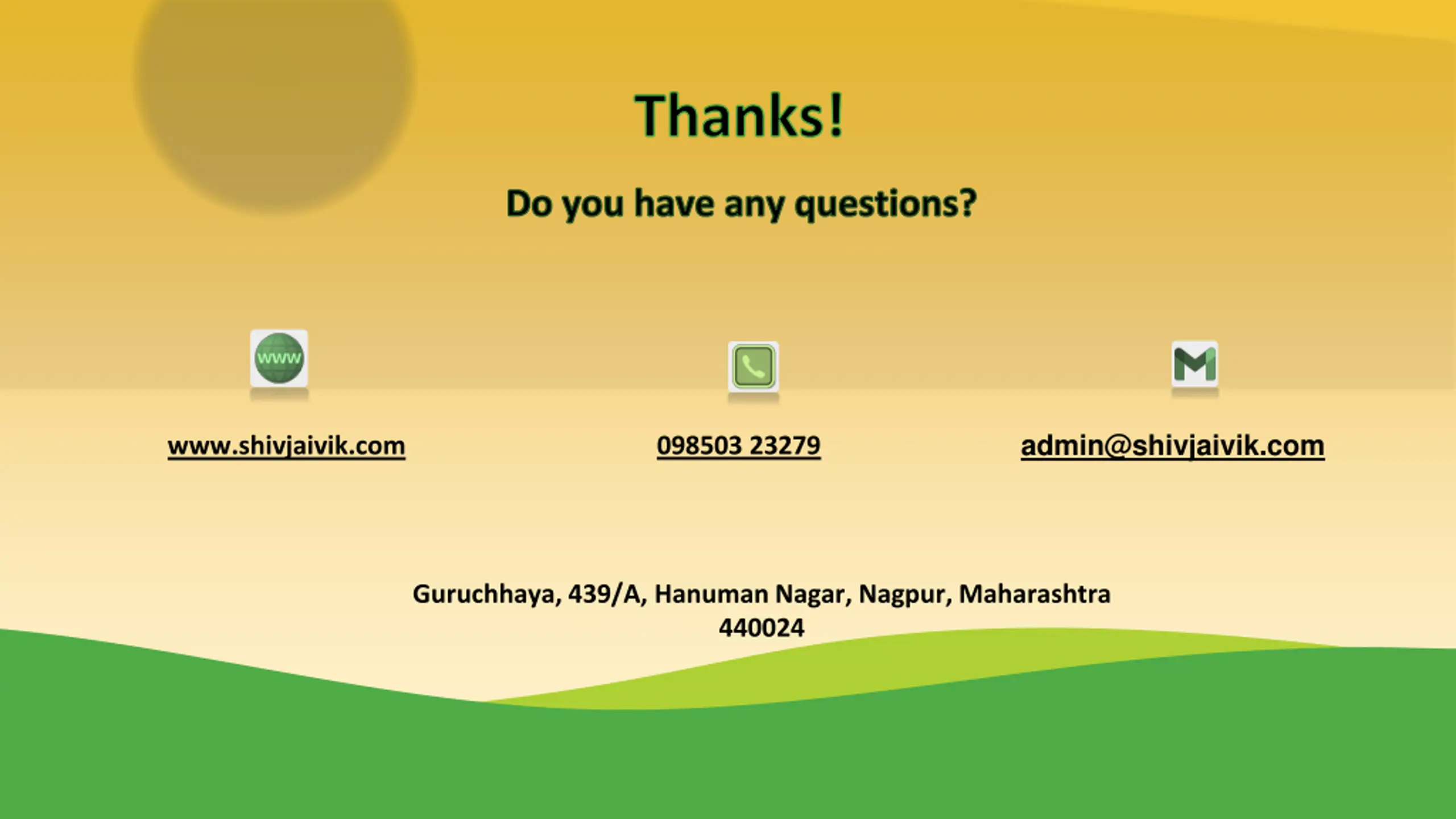 Thanks! Do you have any questions? admin@shivjaivik.com 098503 23279 www.shivjaivik.com Guruchhaya, 439/A, Hanuman Nagar, Nagpur, Maharashtra 440024