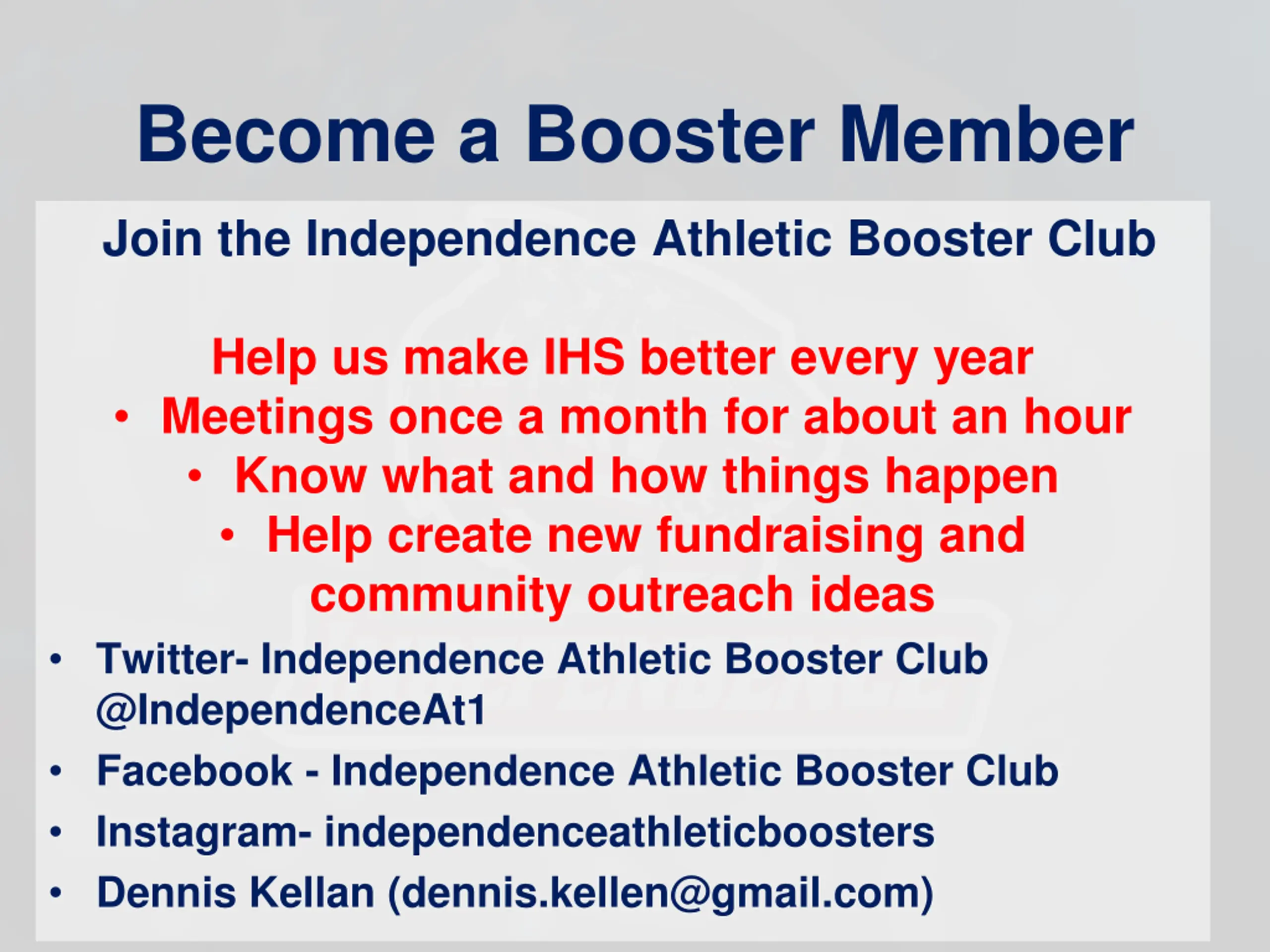 Become a Booster Member Join the Independence Athletic Booster Club Help us make IHS better every year Meetings once a month for about an hour Know what and how things happen Help create new fundraising and community outreach ideas Twitter- Independence Athletic Booster Club @IndependenceAt1 Facebook - Independence Athletic Booster Club Instagram- independenceathleticboosters Dennis Kellan (dennis.kellen@gmail.com)