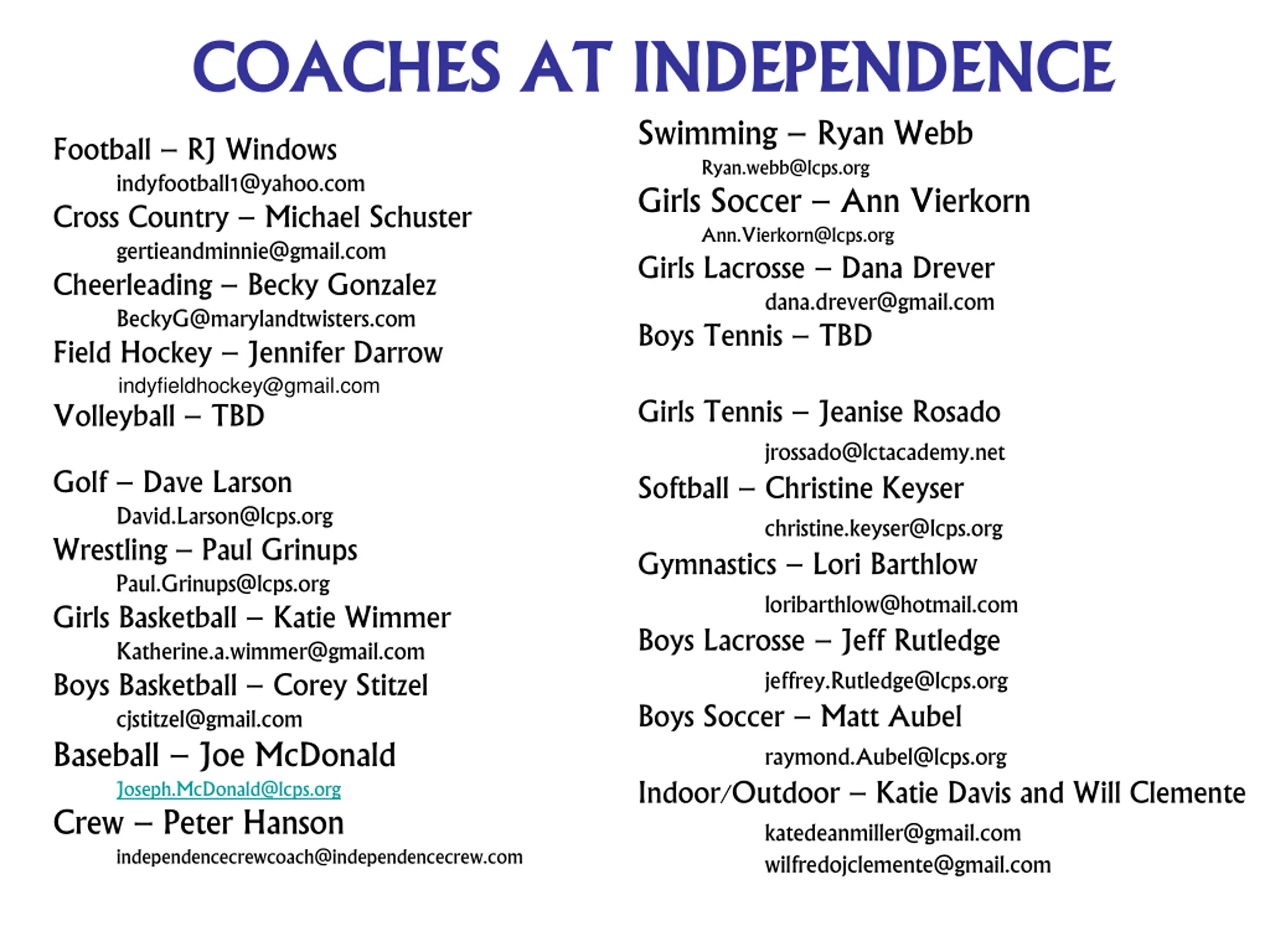 Athletic Department We are available for questions or concerns Ryan Rogers Athletic Director Email: ryan.rogers@lcps.org Phone: 571-367-4218 Mat Shannon Asst. Athletic Director Email: steven.shannon@lcps.org Phone: 571-367-4218 Website: www.independenceathletics.com Find everything you need here from schedules to paperwork