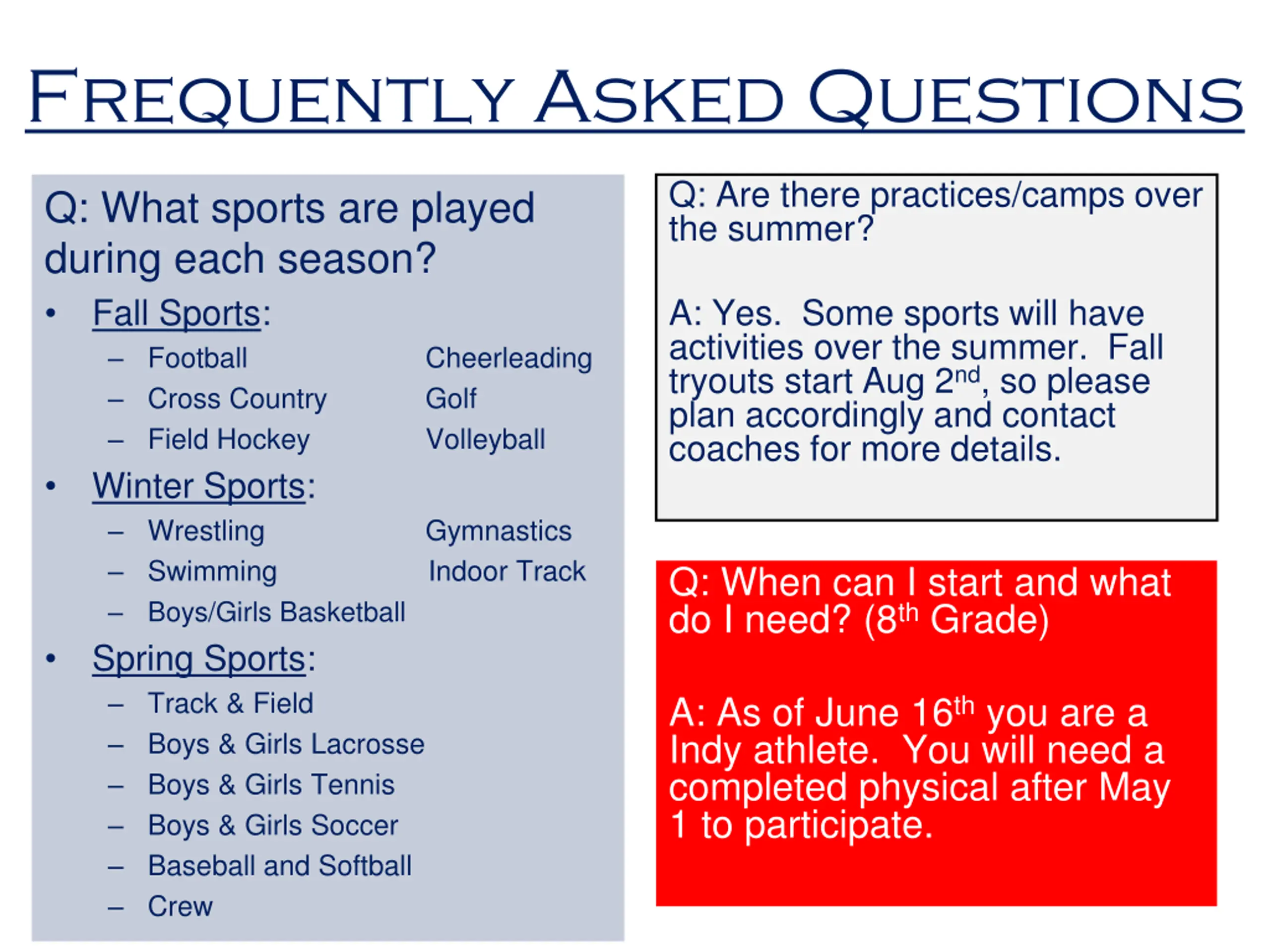 Frequently Asked Questions Q: Are there practices/camps over the summer? Q: What sports are played during each season? Fall Sports: Football Cross Country Field Hockey Winter Sports: Wrestling Swimming Indoor Track Boys/Girls Basketball Spring Sports: Track & Field Boys & Girls Lacrosse Boys & Girls Tennis Boys & Girls Soccer Baseball and Softball Crew A: Yes. Some sports will have activities over the summer. Fall tryouts start Aug 2nd, so please plan accordingly and contact coaches for more details. Cheerleading Golf Volleyball Gymnastics Q: When can I start and what do I need? (8th Grade) A: As of June 16th you are a Indy athlete. You will need a completed physical after May 1 to participate.