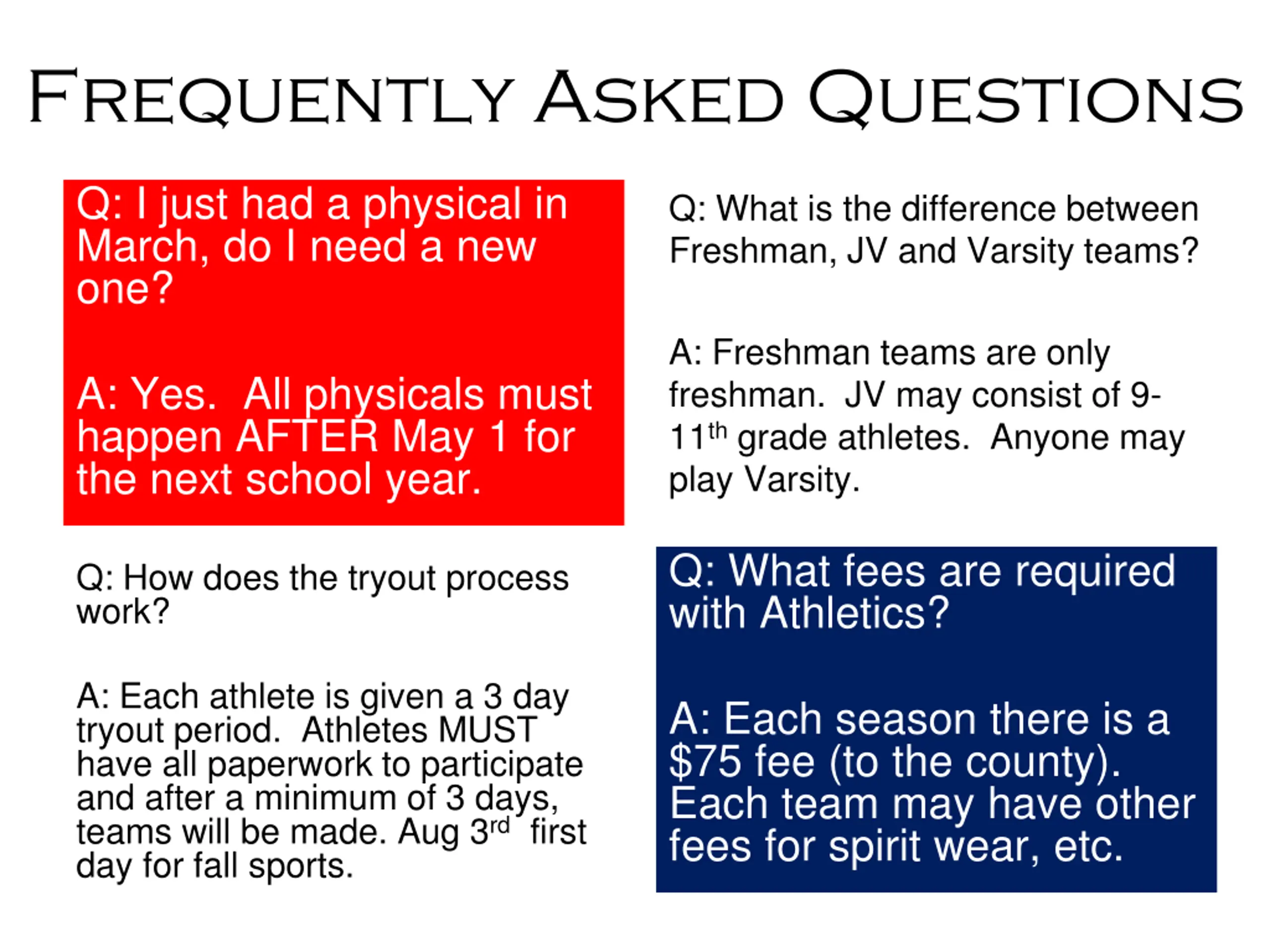Frequently Asked Questions Q: I just had a physical in March, do I need a new one? Q: What is the difference between Freshman, JV and Varsity teams? A: Freshman teams are only freshman. JV may consist of 9- 11th grade athletes. Anyone may play Varsity. A: Yes. All physicals must happen AFTER May 1 for the next school year. Q: What fees are required with Athletics? Q: How does the tryout process work? A: Each athlete is given a 3 day tryout period. Athletes MUST have all paperwork to participate and after a minimum of 3 days, teams will be made. Aug 3rd first day for fall sports. A: Each season there is a $75 fee (to the county). Each team may have other fees for spirit wear, etc.