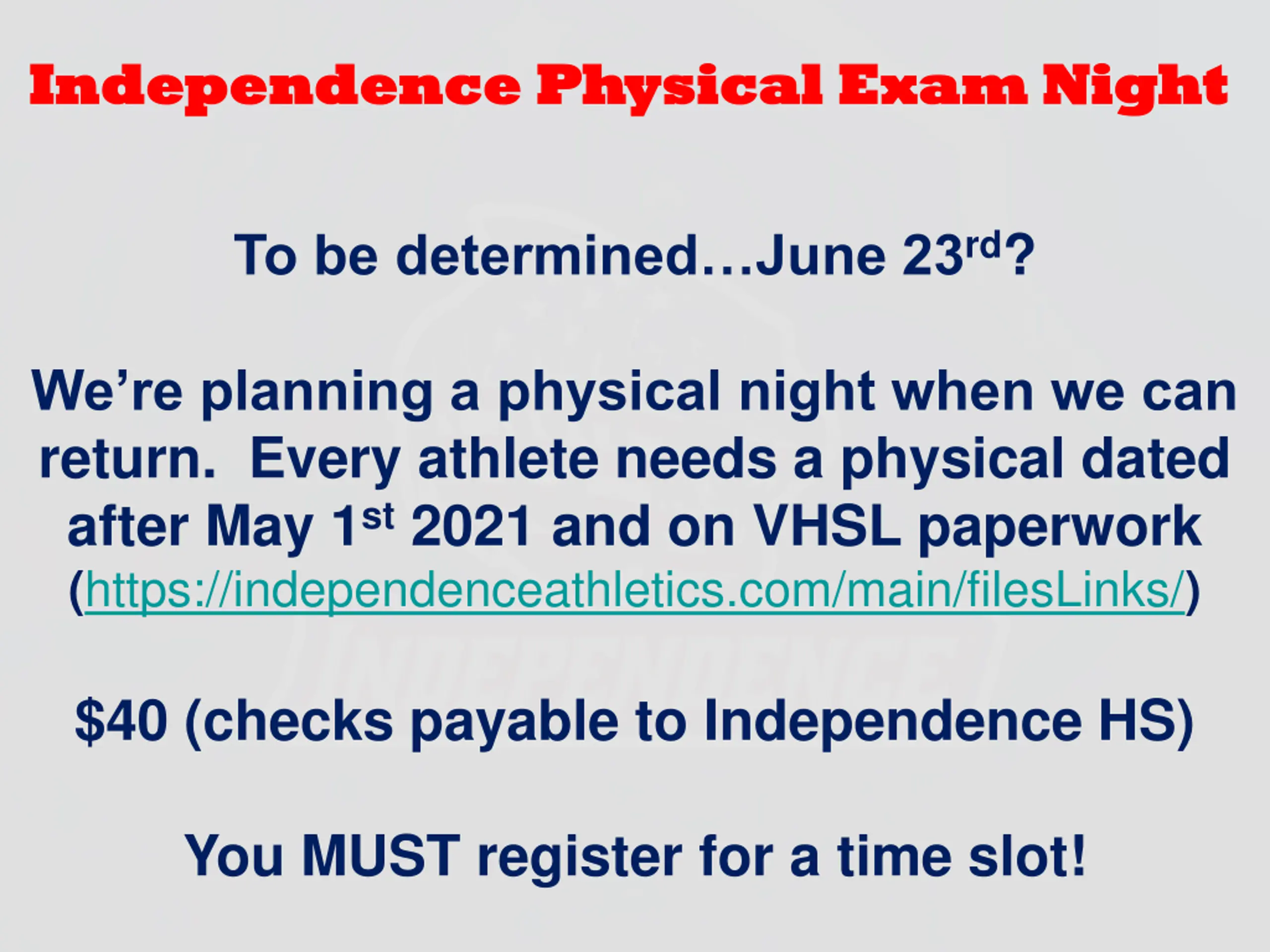 Independence Physical Exam Night Independence Physical Exam Night To be determined June 23rd? We re planning a physical night when we can return. Every athlete needs a physical dated after May 1st 2021 and on VHSL paperwork (https://independenceathletics.com/main/filesLinks/) $40 (checks payable to Independence HS) You MUST register for a time slot!