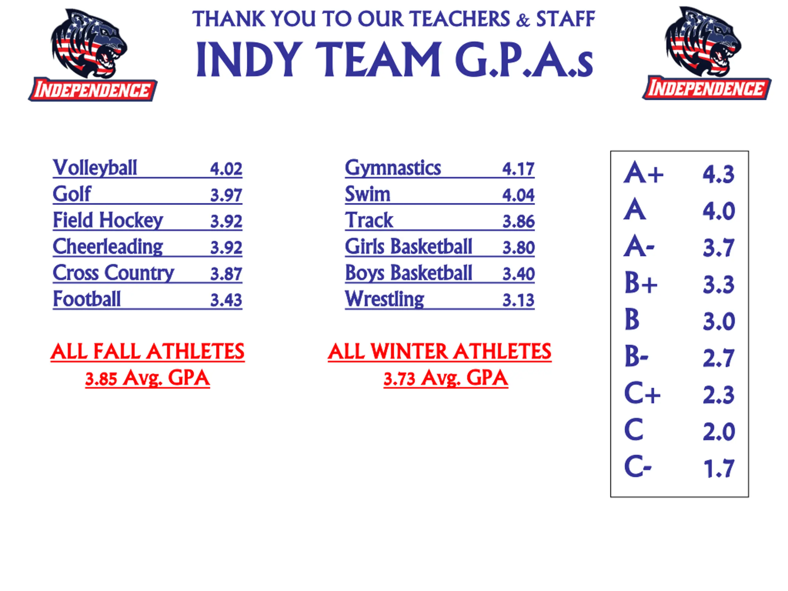 THANK YOU TO OUR TEACHERS & STAFF THANK YOU TO OUR TEACHERS & STAFF INDY TEAM G.P.A.s INDY TEAM G.P.A.s Volleyball Volleyball Golf Golf Field Hockey Field Hockey Cheerleading Cheerleading Cross Country Cross Country Football Football 4.02 4.02 3.97 3.97 3.92 3.92 3.92 3.92 3.87 3.87 3.43 3.43 Gymnastics Gymnastics Swim Swim Track Track Girls Basketball Girls Basketball 3.80 Boys Basketball Boys Basketball Wrestling Wrestling 4.17 4.17 4.04 4.04 3.86 3.86 3.80 3.40 3.40 3.13 3.13 A+ A+ A A A A- - B+ B+ B B B B- - C+ C+ C C C C- - 4.3 4.3 4.0 4.0 3.7 3.7 3.3 3.3 3.0 3.0 2.7 2.7 2.3 2.3 2.0 2.0 1.7 1.7 ALL FALL ATHLETES ALL FALL ATHLETES 3.85 Avg. GPA 3.85 Avg. GPA ALL WINTER ATHLETES ALL WINTER ATHLETES 3.73 Avg. GPA 3.73 Avg. GPA