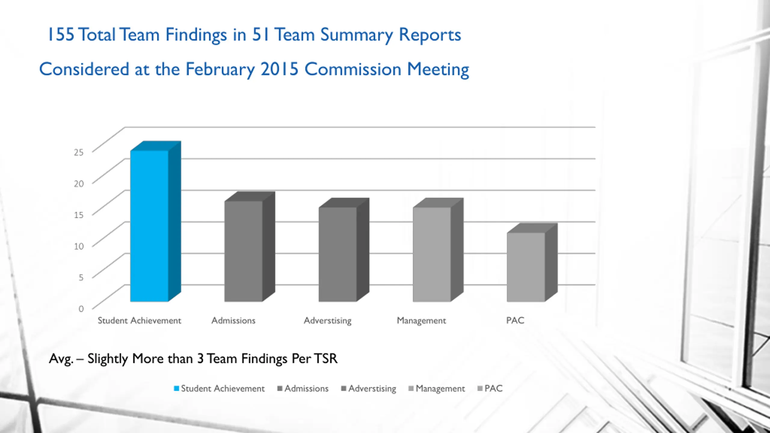 155 Total Team Findings in 51 Team Summary Reports Considered at the February 2015 Commission Meeting 25 20 15 10 5 0 Student Achievement Admissions Adverstising Management PAC Avg. Slightly More than 3 Team Findings Per TSR Student Achievement Admissions Adverstising Management PAC
