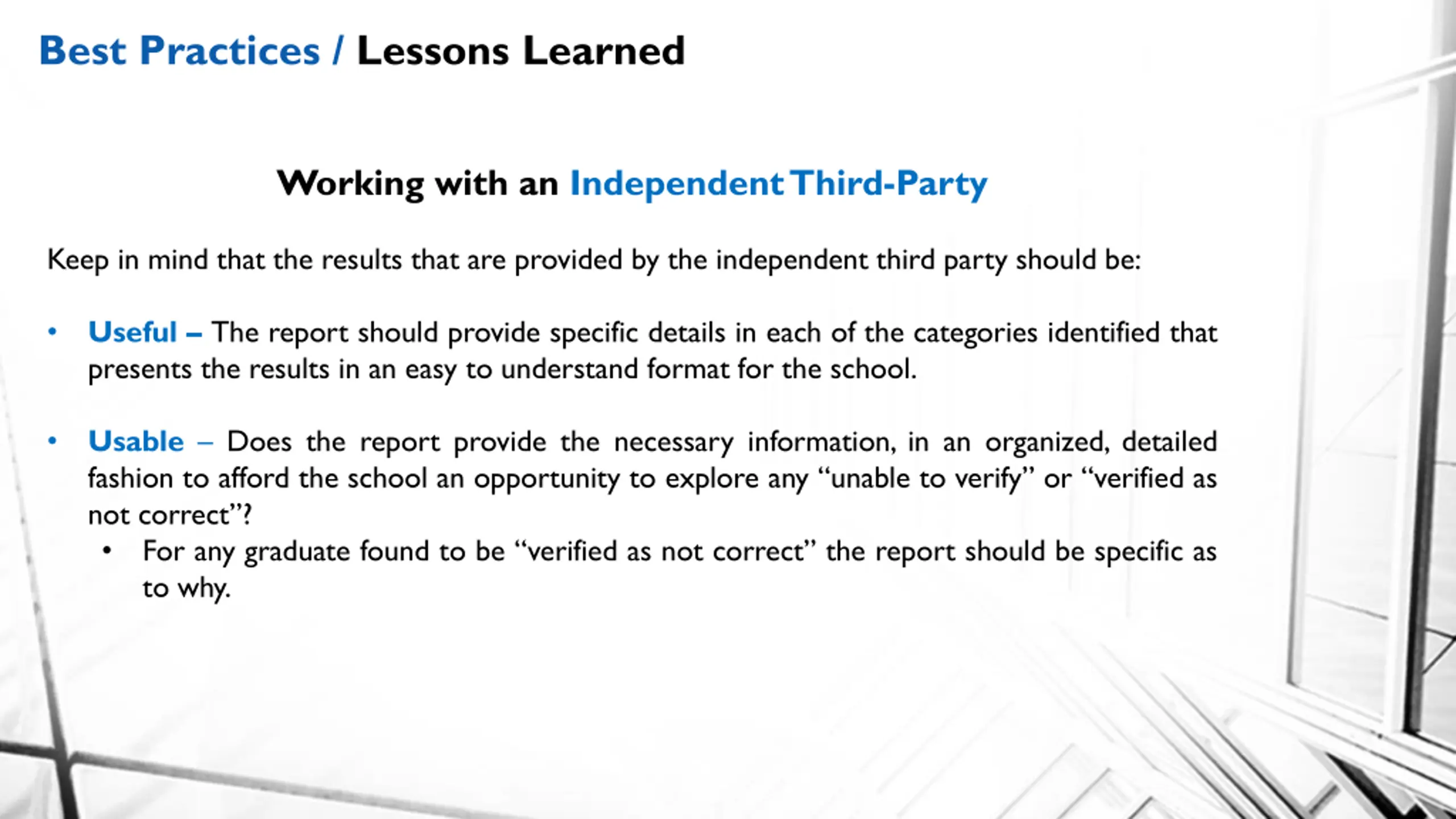 Best Practices / Lessons Learned Working with an Independent Third-Party Keep in mind that the results that are provided by the independent third party should be: Useful The report should provide specific details in each of the categories identified that presents the results in an easy to understand format for the school. Usable Does the report provide the necessary information, in an organized, detailed fashion to afford the school an opportunity to explore any unable to verify or verified as not correct ? For any graduate found to be verified as not correct the report should be specific as to why.