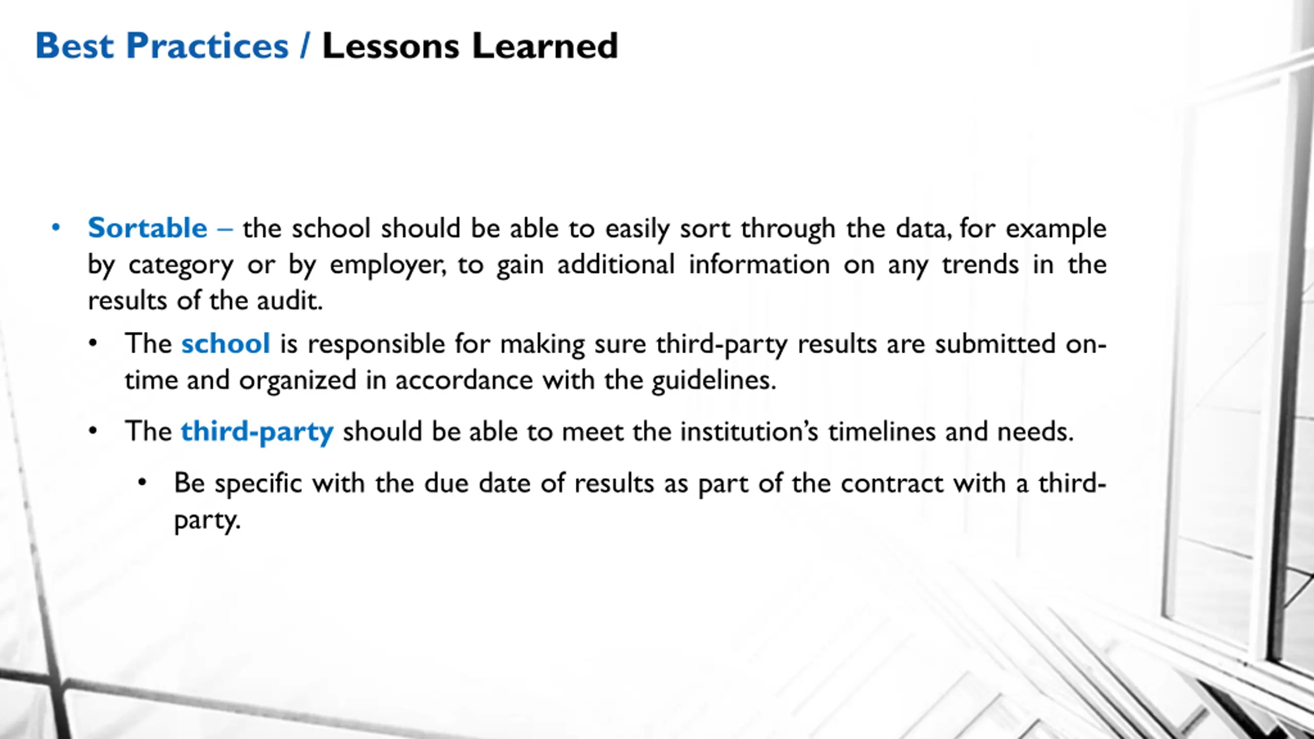 Best Practices / Lessons Learned Sortable the school should be able to easily sort through the data, for example by category or by employer, to gain additional information on any trends in the results of the audit. The school is responsible for making sure third-party results are submitted on- time and organized in accordance with the guidelines. The third-party should be able to meet the institution s timelines and needs. Be specific with the due date of results as part of the contract with a third- party.