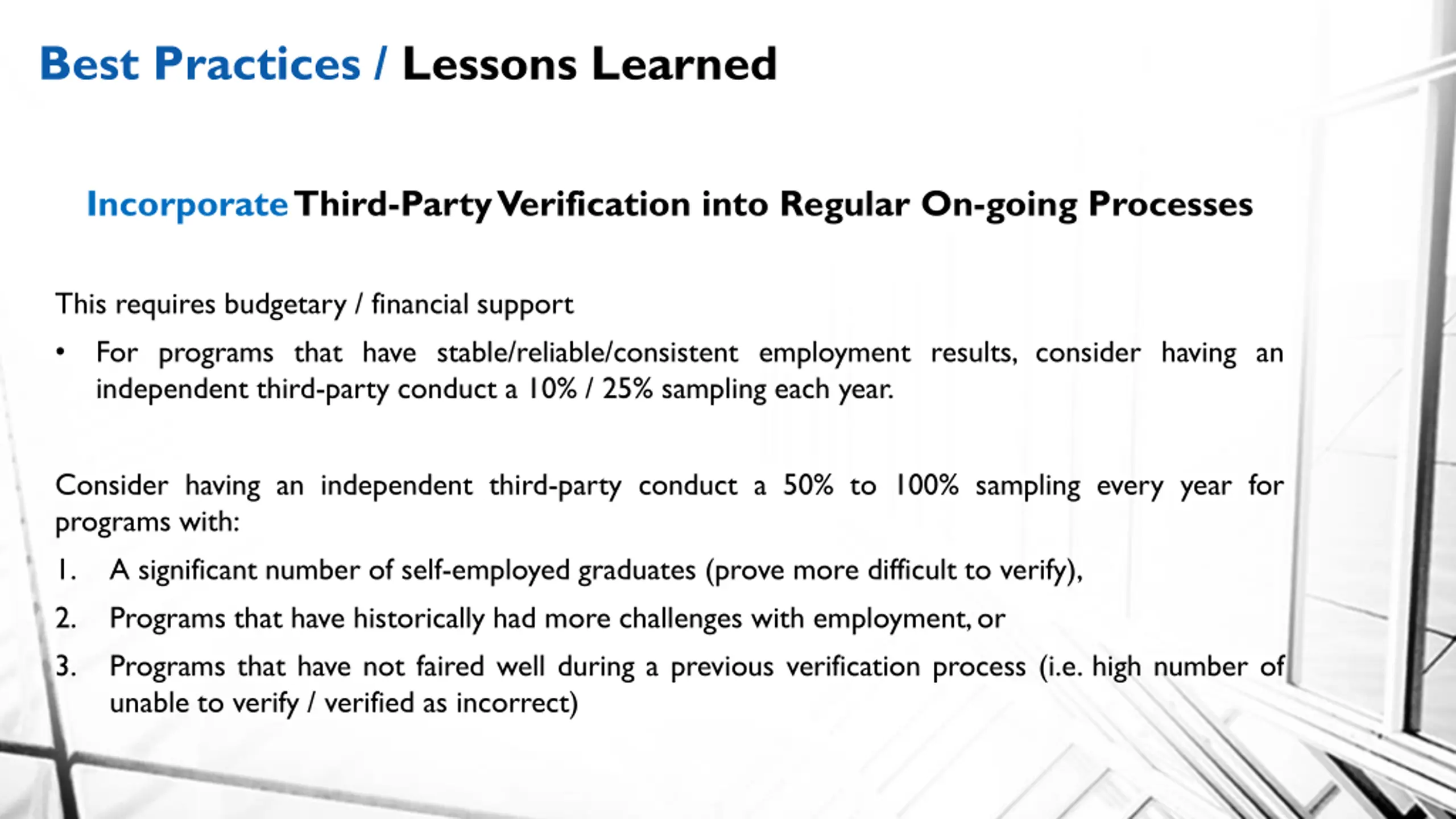 Best Practices / Lessons Learned Incorporate Third-Party Verification into Regular On-going Processes This requires budgetary / financial support For programs that have stable/reliable/consistent employment results, consider having an independent third-party conduct a 10% / 25% sampling each year. Consider having an independent third-party conduct a 50% to 100% sampling every year for programs with: 1. A significant number of self-employed graduates (prove more difficult to verify), 2. Programs that have historically had more challenges with employment, or 3. Programs that have not faired well during a previous verification process (i.e. high number of unable to verify / verified as incorrect)