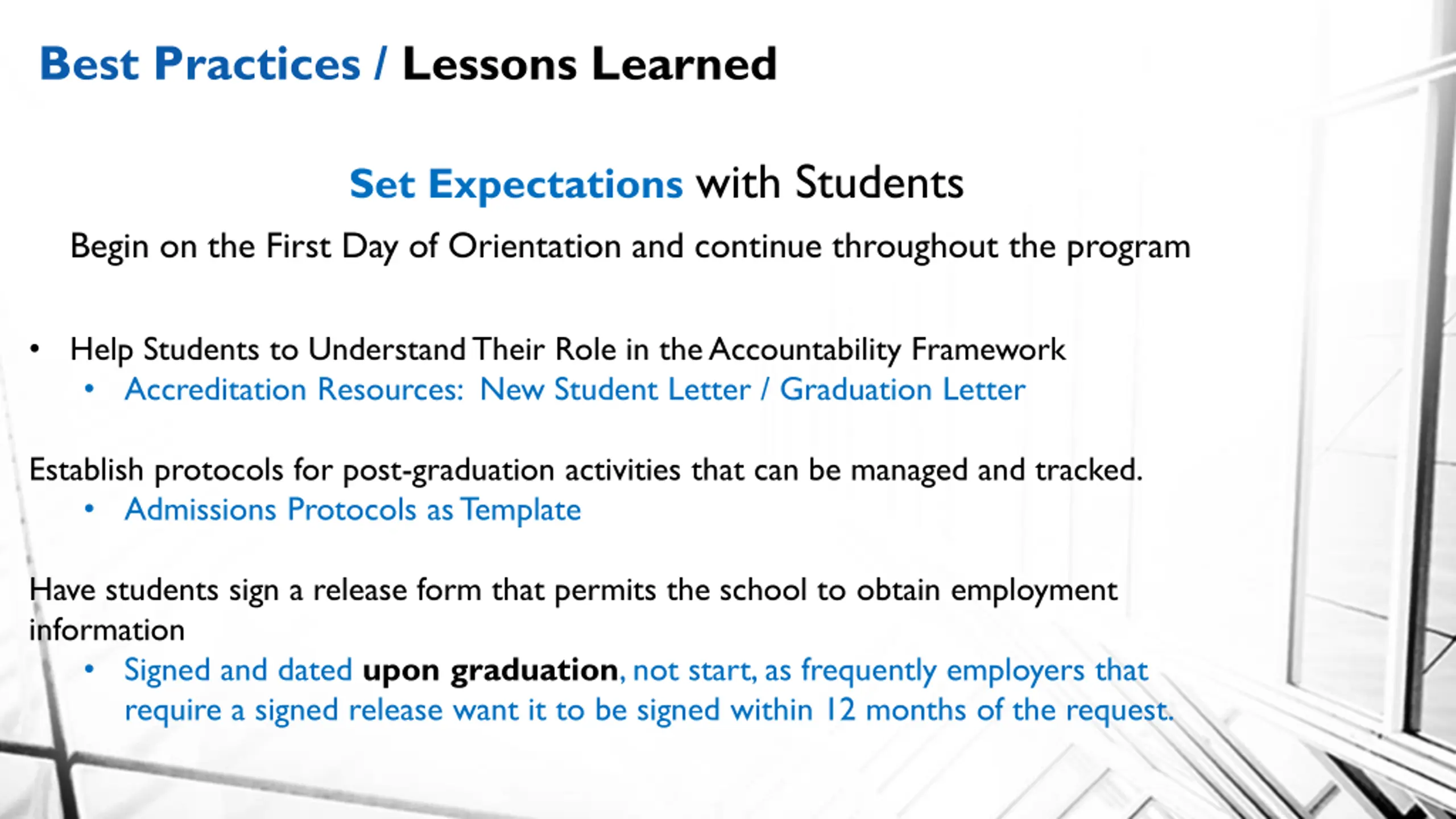 Best Practices / Lessons Learned Set Expectations with Students Begin on the First Day of Orientation and continue throughout the program Help Students to Understand Their Role in the Accountability Framework Accreditation Resources: New Student Letter / Graduation Letter Establish protocols for post-graduation activities that can be managed and tracked. Admissions Protocols as Template Have students sign a release form that permits the school to obtain employment information Signed and dated upon graduation, not start, as frequently employers that require a signed release want it to be signed within 12 months of the request.