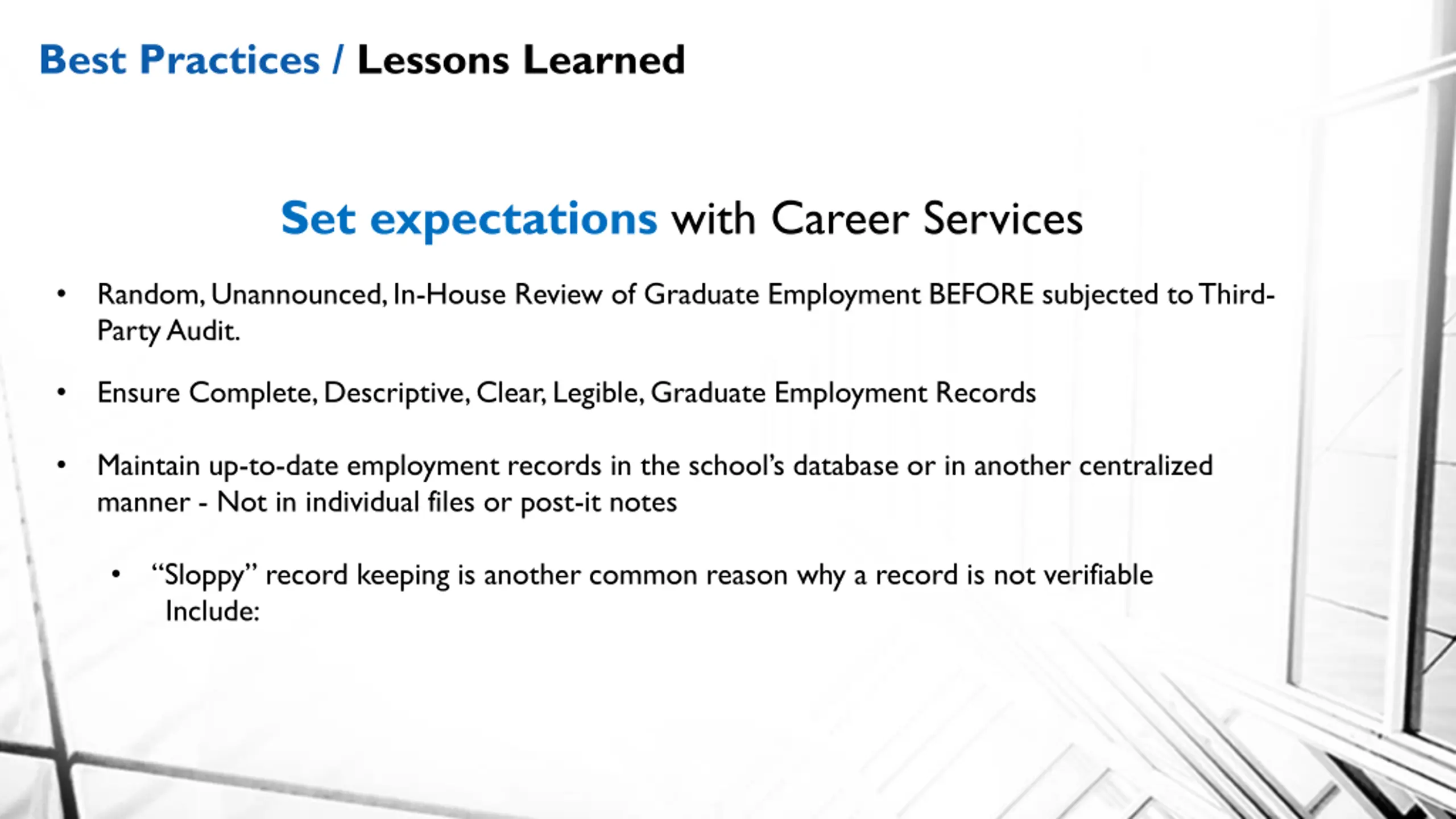 Best Practices / Lessons Learned Set expectations with Career Services Random, Unannounced, In-House Review of Graduate Employment BEFORE subjected to Third- Party Audit. Ensure Complete, Descriptive, Clear, Legible, Graduate Employment Records Maintain up-to-date employment records in the school s database or in another centralized manner - Not in individual files or post-it notes Sloppy record keeping is another common reason why a record is not verifiable Include: