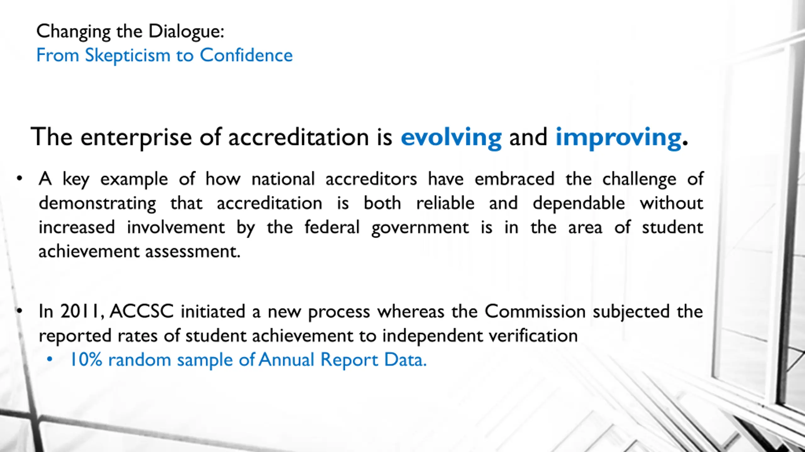 Changing the Dialogue: From Skepticism to Confidence The enterprise of accreditation is evolving and improving. A key example of how national accreditors have embraced the challenge of demonstrating that accreditation is both reliable and dependable without increased involvement by the federal government is in the area of student achievement assessment. In 2011, ACCSC initiated a new process whereas the Commission subjected the reported rates of student achievement to independent verification 10% random sample of Annual Report Data.