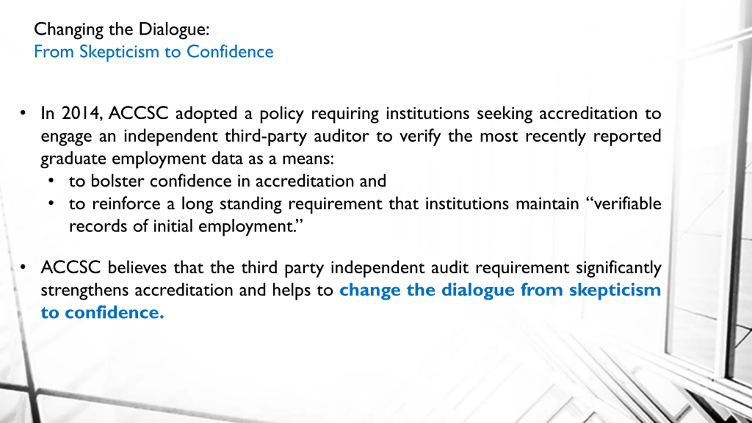 Changing the Dialogue: From Skepticism to Confidence In 2014, ACCSC adopted a policy requiring institutions seeking accreditation to engage an independent third-party auditor to verify the most recently reported graduate employment data as a means: to bolster confidence in accreditation and to reinforce a long standing requirement that institutions maintain verifiable records of initial employment. ACCSC believes that the third party independent audit requirement significantly strengthens accreditation and helps to change the dialogue from skepticism to confidence.