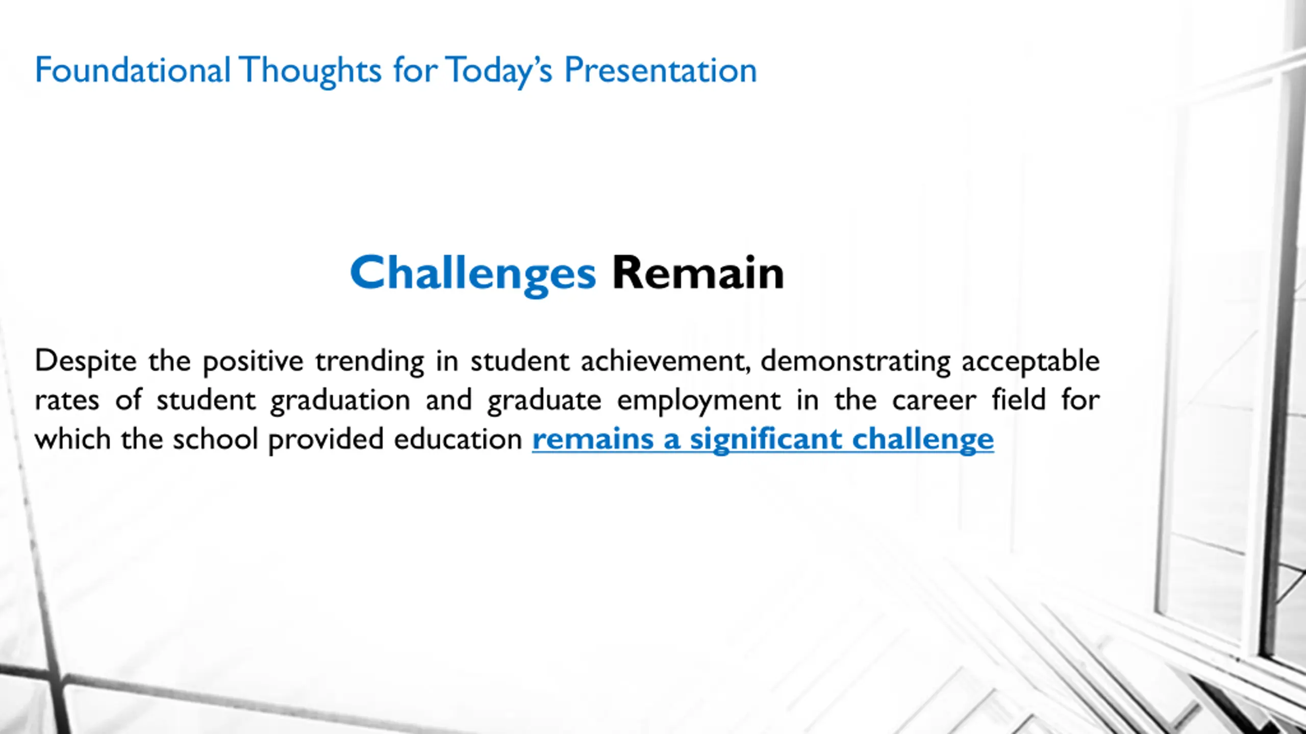 Foundational Thoughts for Todays Presentation Challenges Remain Despite the positive trending in student achievement, demonstrating acceptable rates of student graduation and graduate employment in the career field for which the school provided education remains a significant challenge