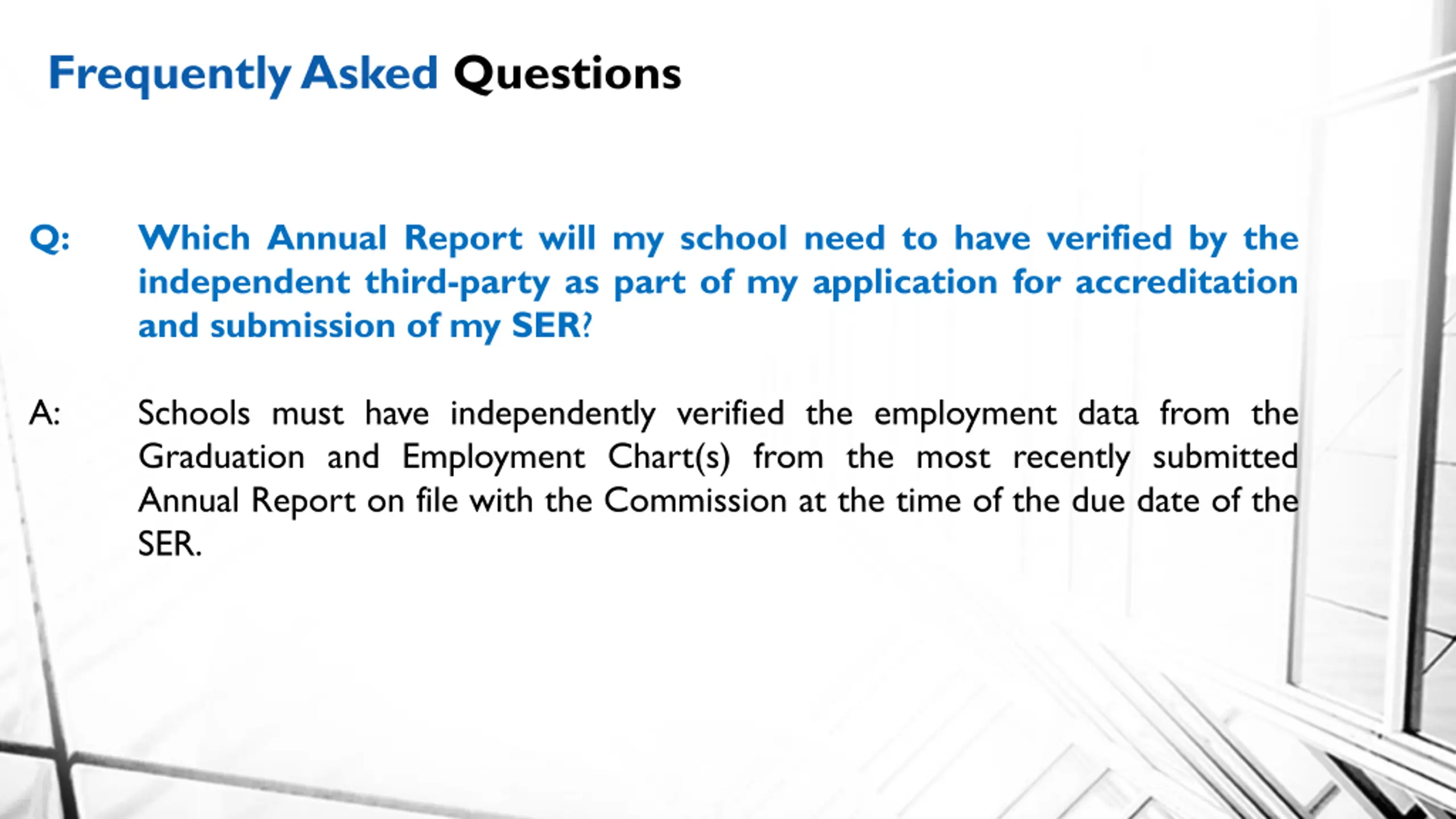 Frequently Asked Questions Q: Which Annual Report will my school need to have verified by the independent third-party as part of my application for accreditation and submission of my SER? A: Schools must have independently verified the employment data from the Graduation and Employment Chart(s) from the most recently submitted Annual Report on file with the Commission at the time of the due date of the SER.