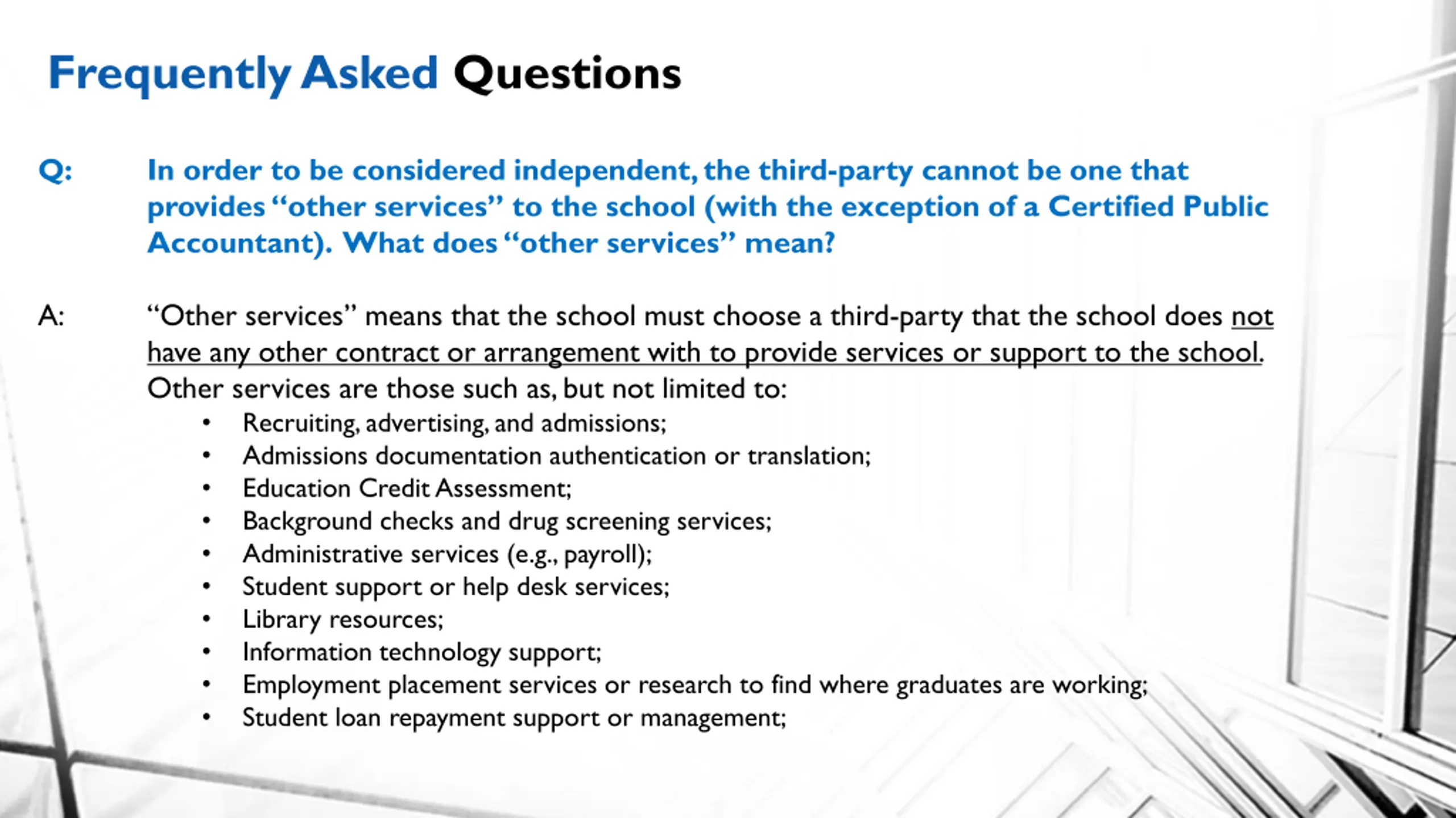 Frequently Asked Questions Q: In order to be considered independent, the third-party cannot be one that provides other services to the school (with the exception of a Certified Public Accountant). What does other services mean? A: Other services means that the school must choose a third-party that the school does not have any other contract or arrangement with to provide services or support to the school. Other services are those such as, but not limited to: Recruiting, advertising, and admissions; Admissions documentation authentication or translation; Education Credit Assessment; Background checks and drug screening services; Administrative services (e.g., payroll); Student support or help desk services; Library resources; Information technology support; Employment placement services or research to find where graduates are working; Student loan repayment support or management;