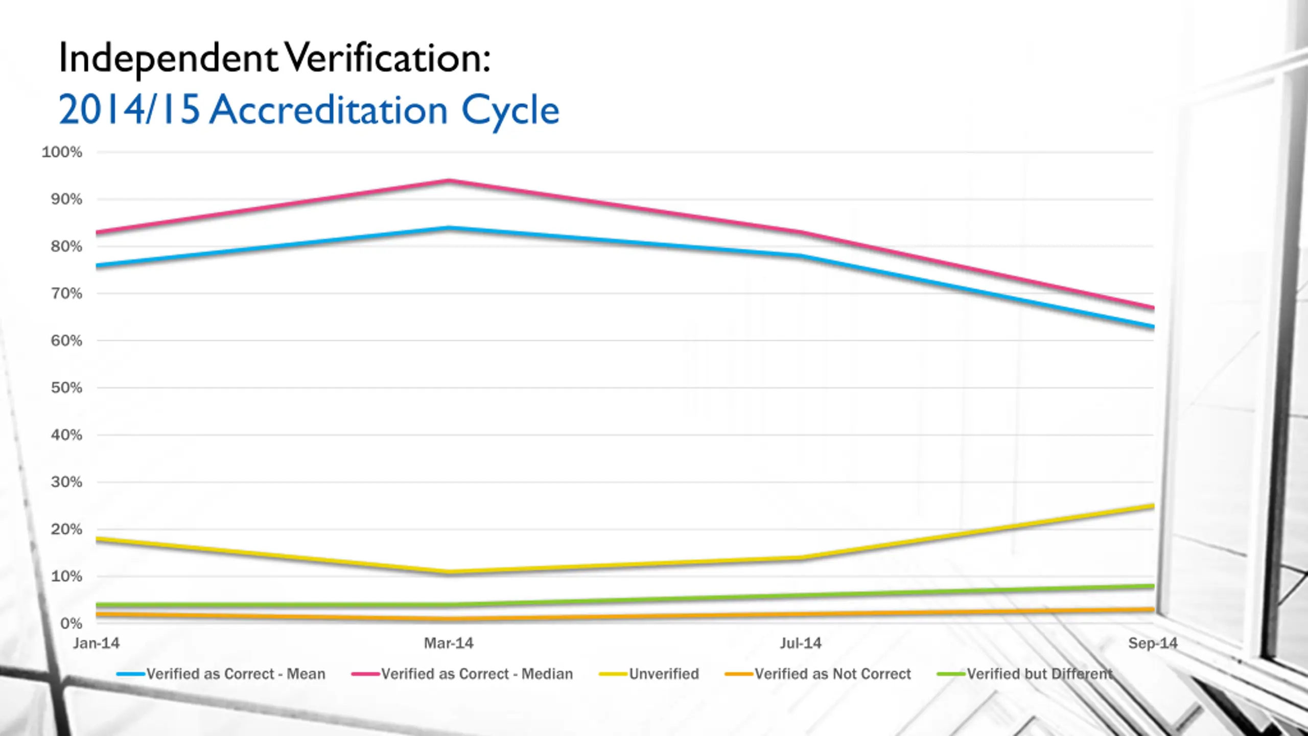 Independent Verification: 2014/15 Accreditation Cycle Verified as Not Correct Verified as Correct Mean Verified as Correct Median Not Verified Verified but Different 76% 83% 18% 4% 2% January 2014 84% 94% 11% 4% 1% March 2014 78% 83% 14% 6% 2% July 2014 63% 67% 25% 8% 3% September 2014 Overall 75% 79% 17% 5% 2%