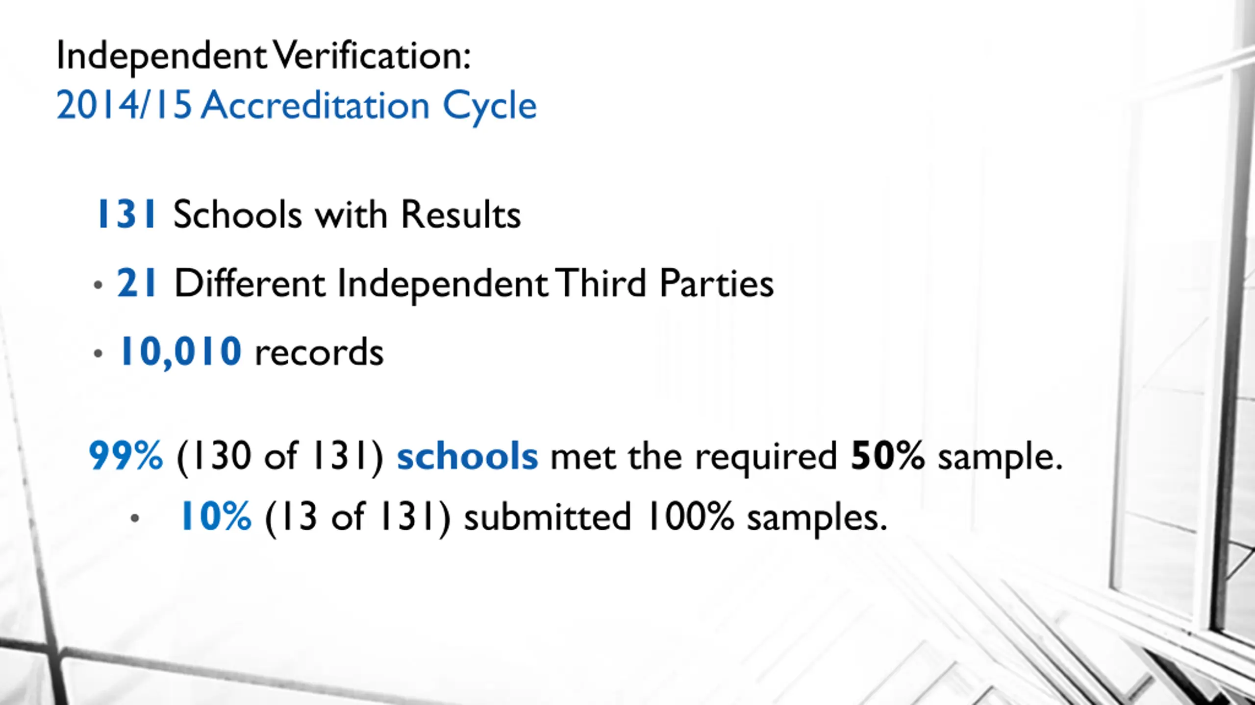 Independent Verification: 2014/15 Accreditation Cycle 131 Schools with Results 21 Different Independent Third Parties 10,010 records 99% (130 of 131) schools met the required 50% sample. 10% (13 of 131) submitted 100% samples.