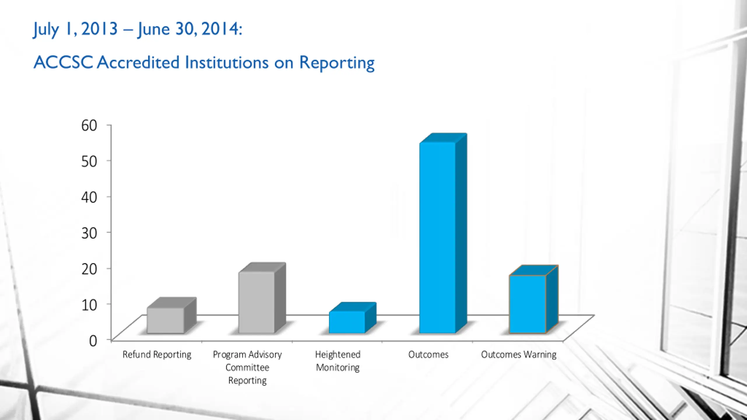 July 1, 2013 June 30, 2014: ACCSC Accredited Institutions on Reporting 60 50 40 30 20 10 0 Refund Reporting Program Advisory Committee Reporting Heightened Monitoring Outcomes Outcomes Warning