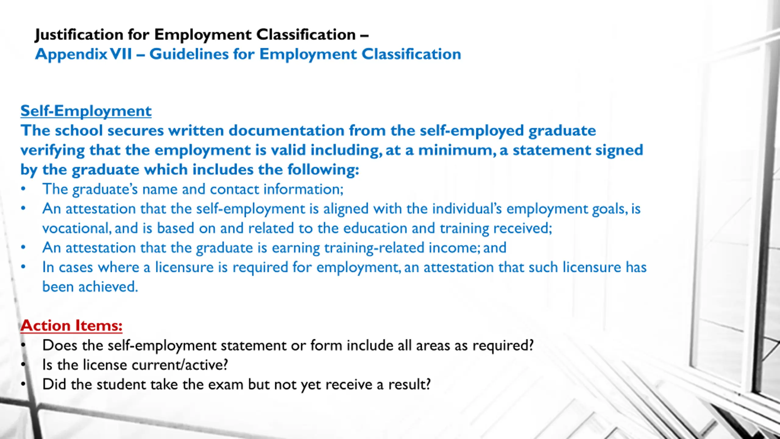Justification for Employment Classification Appendix VII Guidelines for Employment Classification Self-Employment The school secures written documentation from the self-employed graduate verifying that the employment is valid including, at a minimum, a statement signed by the graduate which includes the following: The graduate s name and contact information; An attestation that the self-employment is aligned with the individual s employment goals, is vocational, and is based on and related to the education and training received; An attestation that the graduate is earning training-related income; and In cases where a licensure is required for employment, an attestation that such licensure has been achieved. Action Items: Does the self-employment statement or form include all areas as required? Is the license current/active? Did the student take the exam but not yet receive a result?