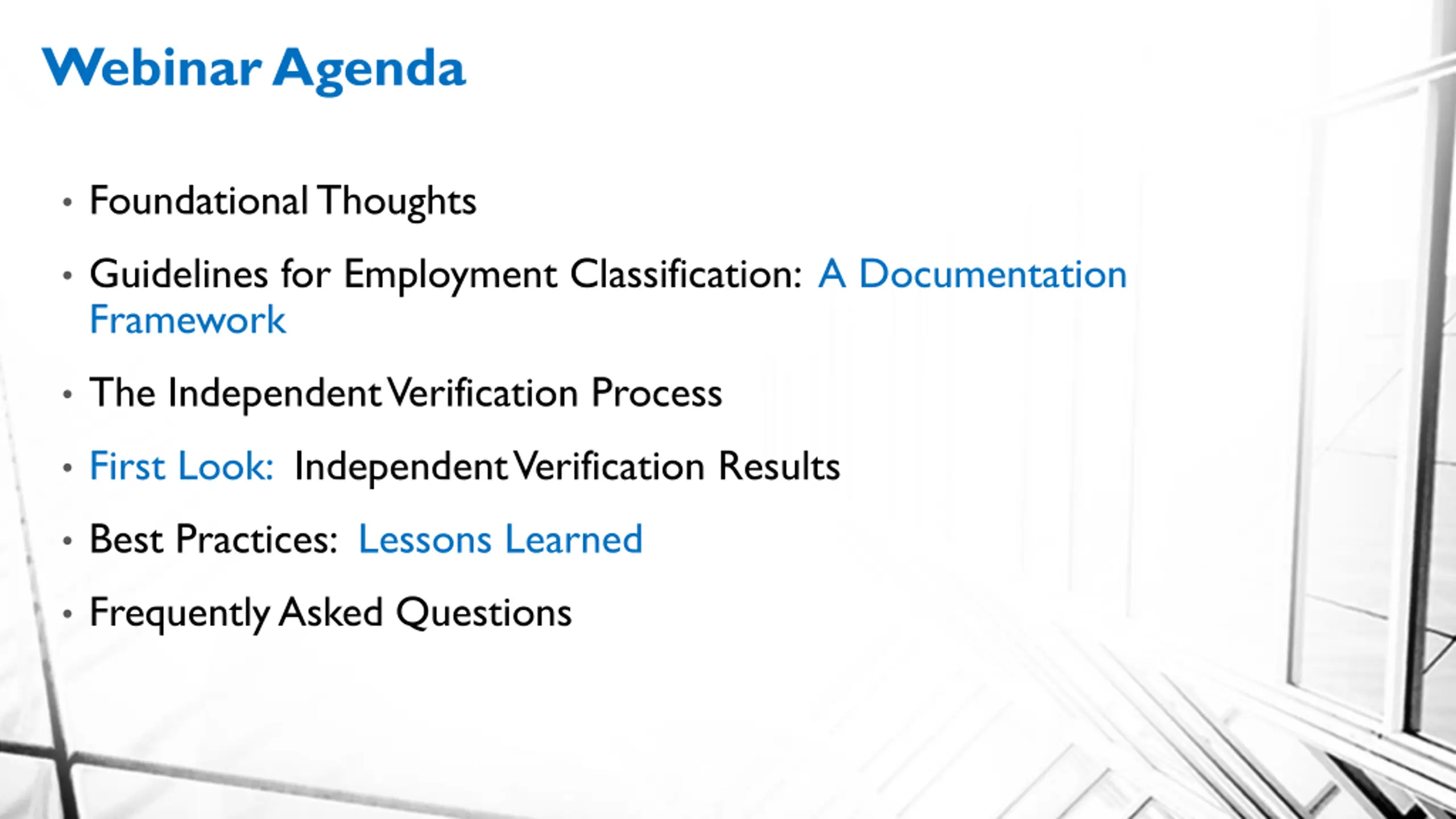 Webinar Agenda Foundational Thoughts Guidelines for Employment Classification: A Documentation Framework The Independent Verification Process First Look: Independent Verification Results Best Practices: Lessons Learned Frequently Asked Questions