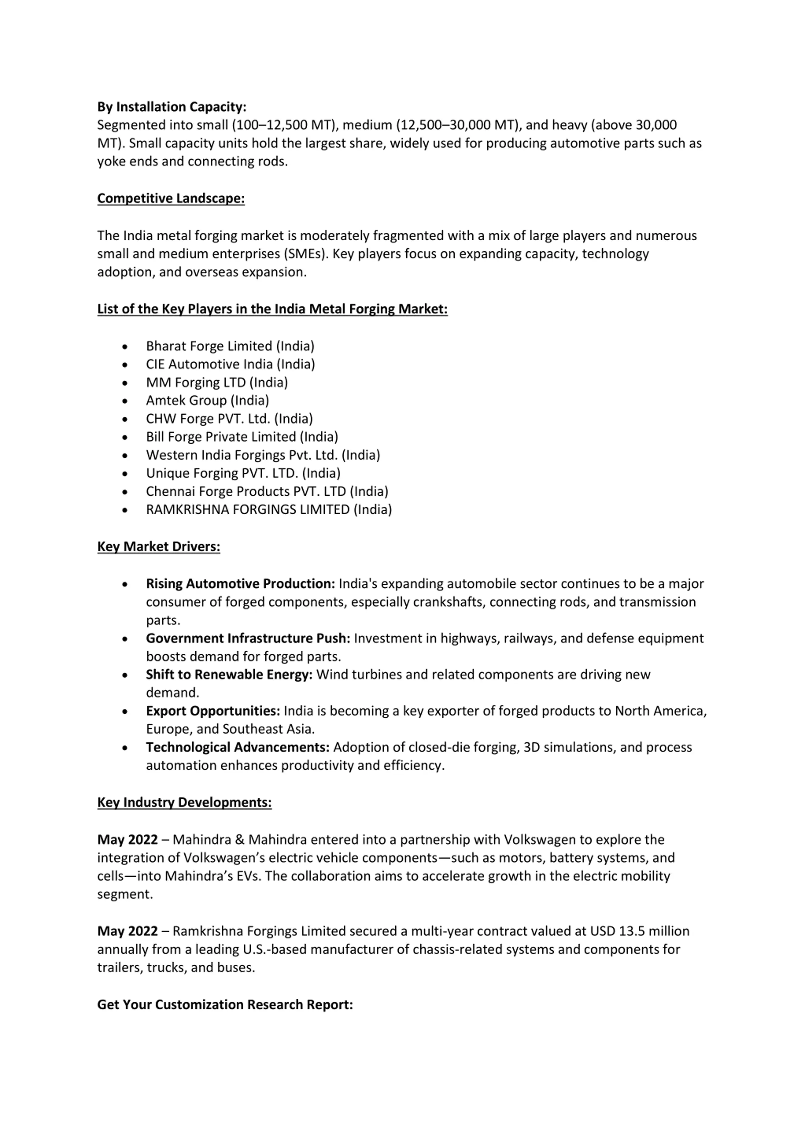 By Installation Capacity: Segmented into small (100 12,500 MT), medium (12,500 30,000 MT), and heavy (above 30,000 MT). Small capacity units hold the largest share, widely used for producing automotive parts such as yoke ends and connecting rods. Competitive Landscape: The India metal forging market is moderately fragmented with a mix of large players and numerous small and medium enterprises (SMEs). Key players focus on expanding capacity, technology adoption, and overseas expansion. List of the Key Players in the India Metal Forging Market: Bharat Forge Limited (India) CIE Automotive India (India) MM Forging LTD (India) Amtek Group (India) CHW Forge PVT. Ltd. (India) Bill Forge Private Limited (India) Western India Forgings Pvt. Ltd. (India) Unique Forging PVT. LTD. (India) Chennai Forge Products PVT. LTD (India) RAMKRISHNA FORGINGS LIMITED (India) Key Market Drivers: Rising Automotive Production: India's expanding automobile sector continues to be a major consumer of forged components, especially crankshafts, connecting rods, and transmission parts. Government Infrastructure Push: Investment in highways, railways, and defense equipment boosts demand for forged parts. Shift to Renewable Energy: Wind turbines and related components are driving new demand. Export Opportunities: India is becoming a key exporter of forged products to North America, Europe, and Southeast Asia. Technological Advancements: Adoption of closed-die forging, 3D simulations, and process automation enhances productivity and efficiency. Key Industry Developments: May 2022 Mahindra & Mahindra entered into a partnership with Volkswagen to explore the integration of Volkswagen s electric vehicle components such as motors, battery systems, and cells into Mahindra s EVs. The collaboration aims to accelerate growth in the electric mobility segment. May 2022 Ramkrishna Forgings Limited secured a multi-year contract valued at USD 13.5 million annually from a leading U.S.-based manufacturer of chassis-related systems and components for trailers, trucks, and buses. Get Your Customization Research Report: