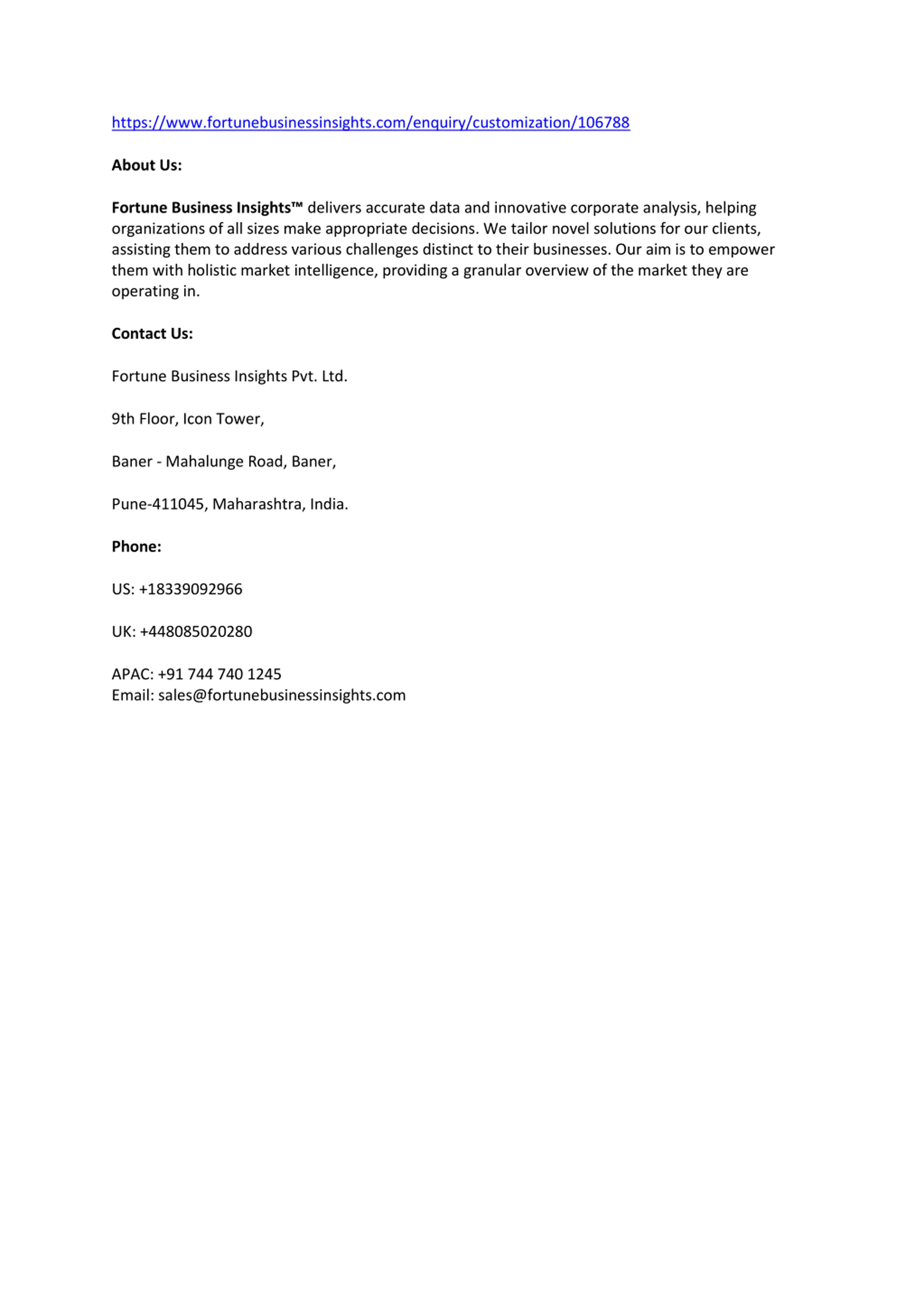 https://www.fortunebusinessinsights.com/enquiry/customization/106788 About Us: Fortune Business Insights delivers accurate data and innovative corporate analysis, helping organizations of all sizes make appropriate decisions. We tailor novel solutions for our clients, assisting them to address various challenges distinct to their businesses. Our aim is to empower them with holistic market intelligence, providing a granular overview of the market they are operating in. Contact Us: Fortune Business Insights Pvt. Ltd. 9th Floor, Icon Tower, Baner - Mahalunge Road, Baner, Pune-411045, Maharashtra, India. Phone: US: +18339092966 UK: +448085020280 APAC: +91 744 740 1245 Email: sales@fortunebusinessinsights.com