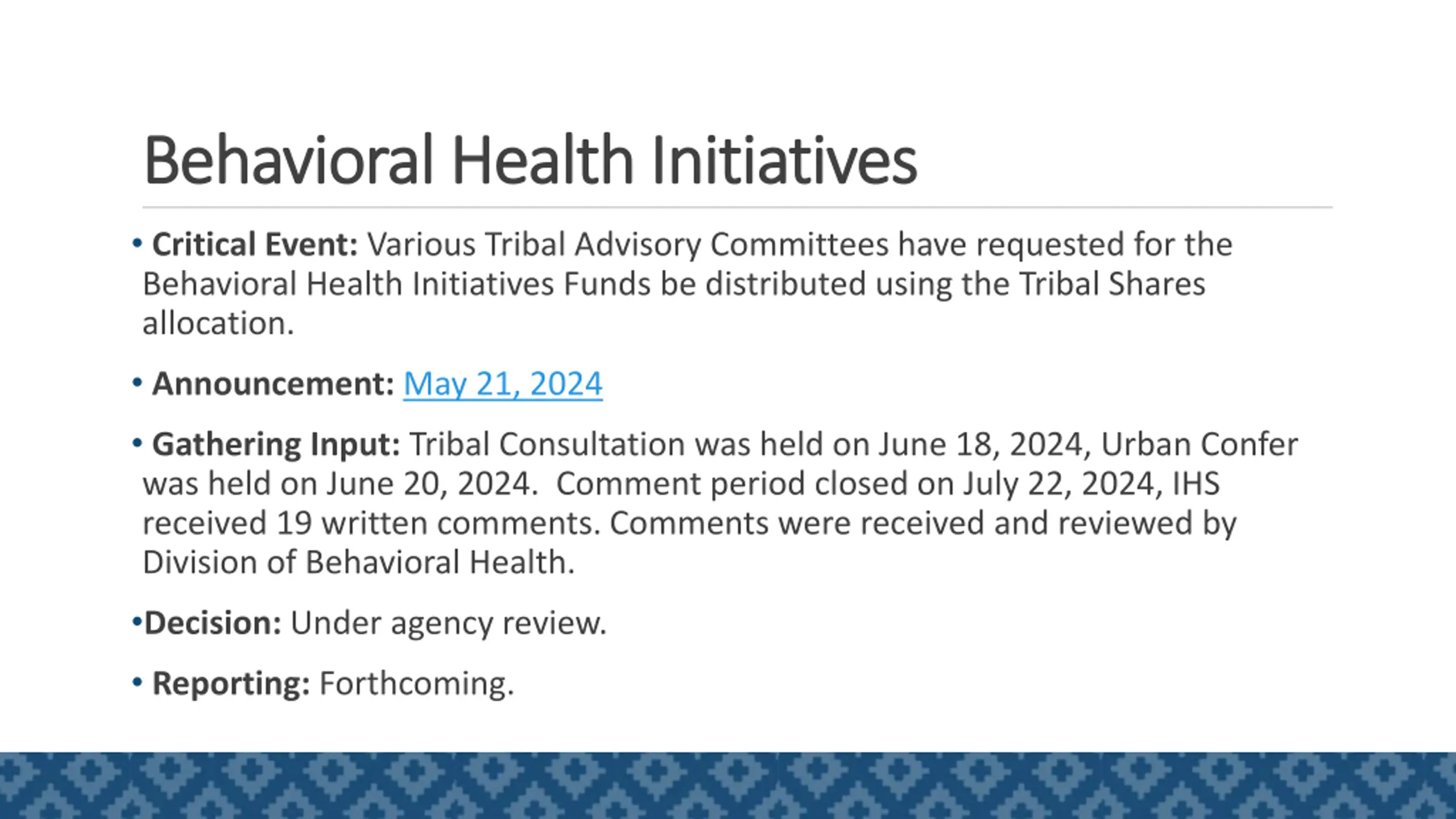Behavioral Health Initiatives Behavioral Health Initiatives Critical Event: Various Tribal Advisory Committees have requested for the Behavioral Health Initiatives Funds be distributed using the Tribal Shares allocation. Announcement: May 21, 2024 Gathering Input: Tribal Consultation was held on June 18, 2024, Urban Confer was held on June 20, 2024. Comment period closed on July 22, 2024, IHS received 19 written comments. Comments were received and reviewed by Division of Behavioral Health. Decision: Under agency review. Reporting: Forthcoming. 7