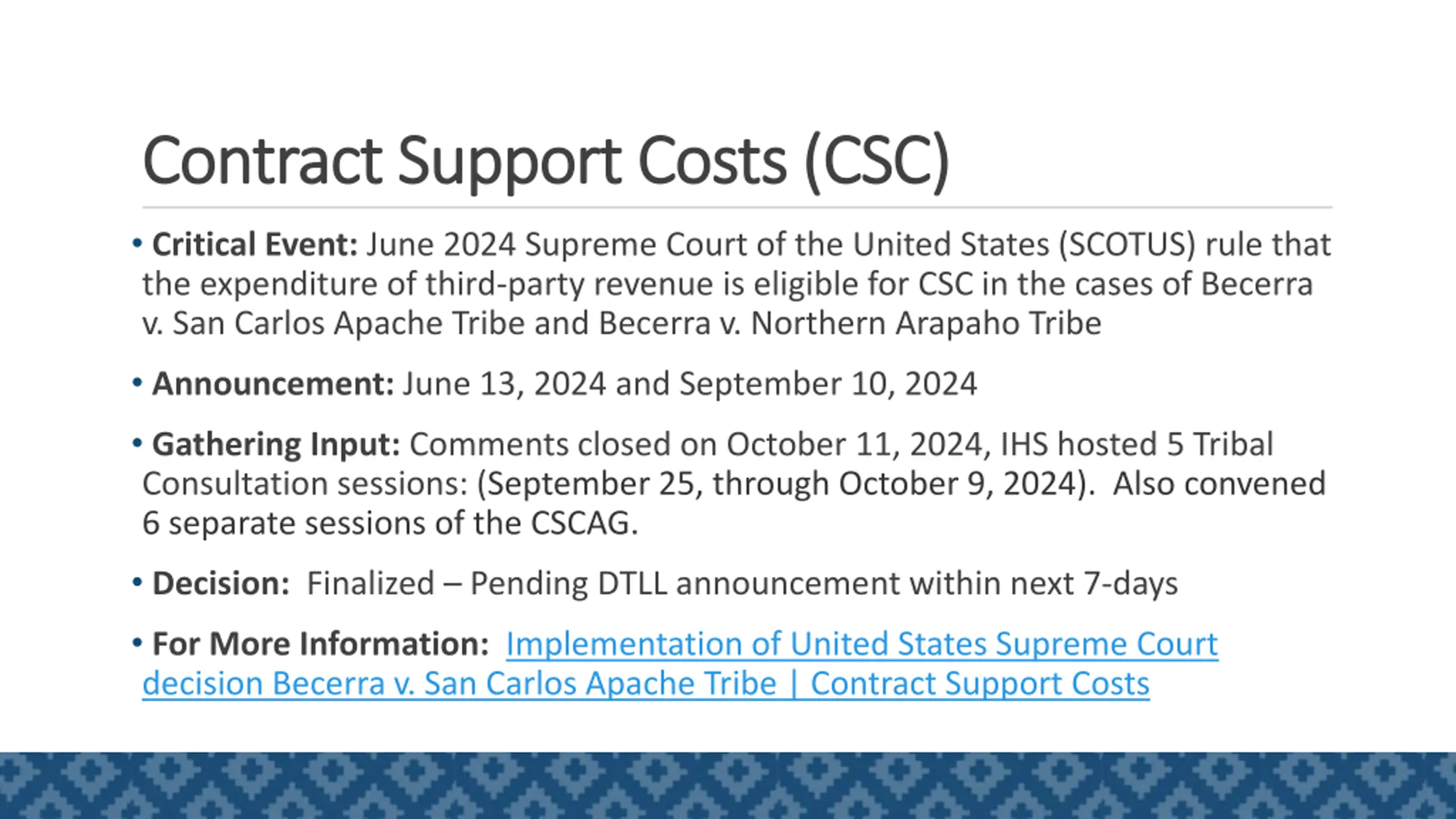 Contract Support Costs (CSC) Contract Support Costs (CSC) Critical Event: June 2024 Supreme Court of the United States (SCOTUS) rule that the expenditure of third-party revenue is eligible for CSC in the cases of Becerra v. San Carlos Apache Tribe and Becerra v. Northern Arapaho Tribe Announcement: June 13, 2024 and September 10, 2024 Gathering Input: Comments closed on October 11, 2024, IHS hosted 5 Tribal Consultation sessions: (September 25, through October 9, 2024). Also convened 6 separate sessions of the CSCAG. Decision: Finalized Pending DTLL announcement within next 7-days For More Information: Implementation of United States Supreme Court decision Becerra v. San Carlos Apache Tribe | Contract Support Costs 12
