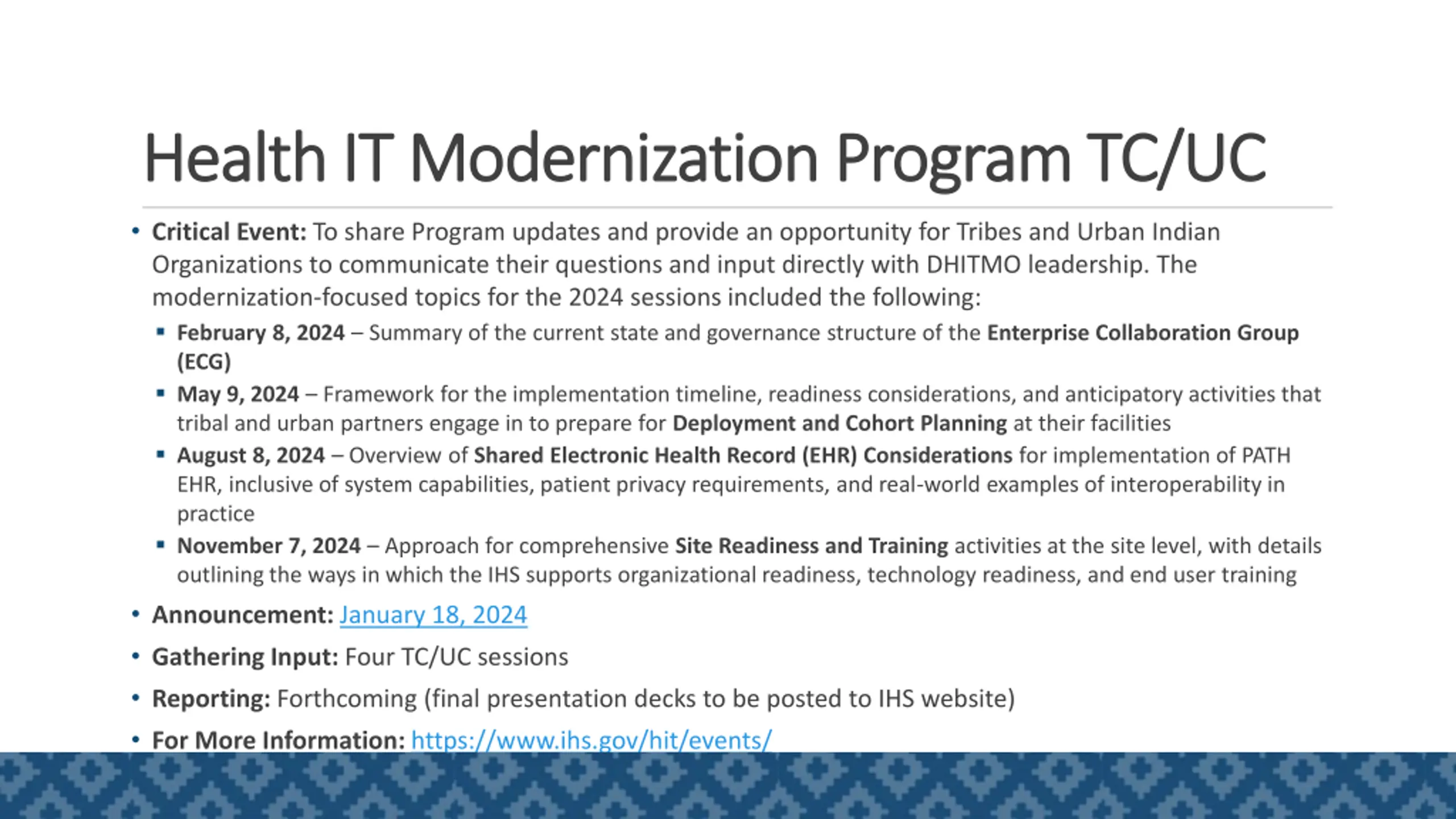 Health IT Modernization Program TC/UC Health IT Modernization Program TC/UC Critical Event: To share Program updates and provide an opportunity for Tribes and Urban Indian Organizations to communicate their questions and input directly with DHITMO leadership. The modernization-focused topics for the 2024 sessions included the following: February 8, 2024 Summary of the current state and governance structure of the Enterprise Collaboration Group (ECG) May 9, 2024 Framework for the implementation timeline, readiness considerations, and anticipatory activities that tribal and urban partners engage in to prepare for Deployment and Cohort Planning at their facilities August 8, 2024 Overview of Shared Electronic Health Record (EHR) Considerations for implementation of PATH EHR, inclusive of system capabilities, patient privacy requirements, and real-world examples of interoperability in practice November 7, 2024 Approach for comprehensive Site Readiness and Training activities at the site level, with details outlining the ways in which the IHS supports organizational readiness, technology readiness, and end user training Announcement: January 18, 2024 Gathering Input: Four TC/UC sessions Reporting: Forthcoming (final presentation decks to be posted to IHS website) For More Information: https://www.ihs.gov/hit/events/ 4
