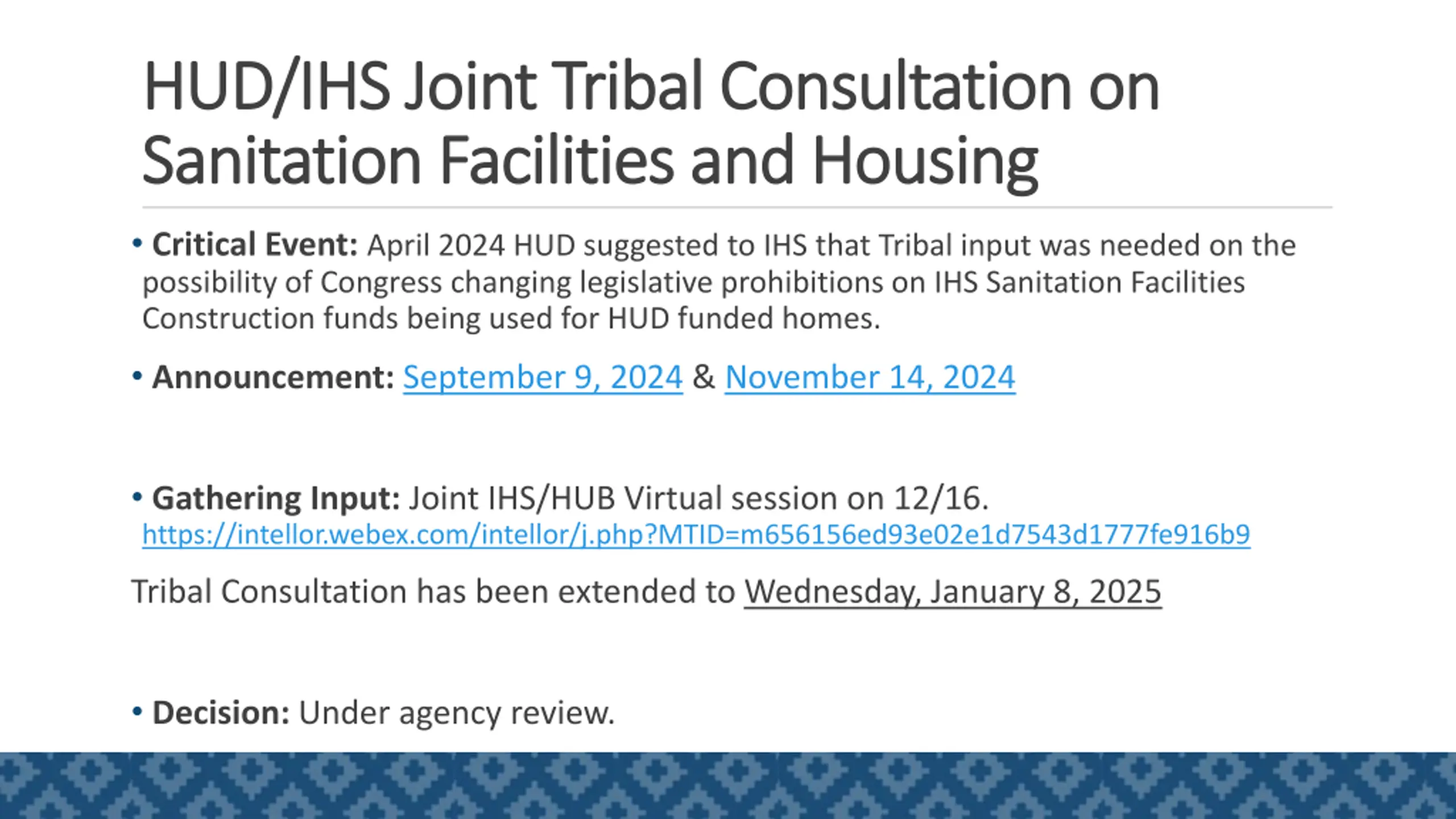 HUD/IHS Joint Tribal Consultation on HUD/IHS Joint Tribal Consultation on Sanitation Facilities and Housing Sanitation Facilities and Housing Critical Event: April 2024 HUD suggested to IHS that Tribal input was needed on the possibility of Congress changing legislative prohibitions on IHS Sanitation Facilities Construction funds being used for HUD funded homes. Announcement: September 9, 2024 & November 14, 2024 Gathering Input: Joint IHS/HUB Virtual session on 12/16. https://intellor.webex.com/intellor/j.php?MTID=m656156ed93e02e1d7543d1777fe916b9 Tribal Consultation has been extended to Wednesday, January 8, 2025 Decision: Under agency review. 10