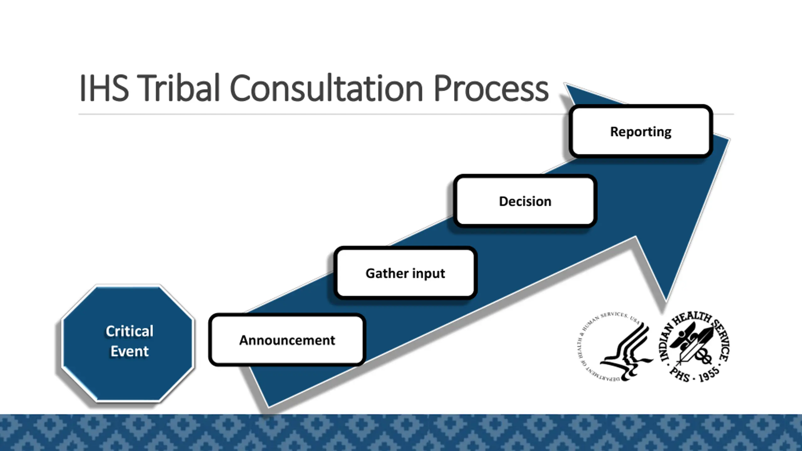 IHS Tribal Consultation Process IHS Tribal Consultation Process Reporting Decision Gather input Critical Event Announcement 2