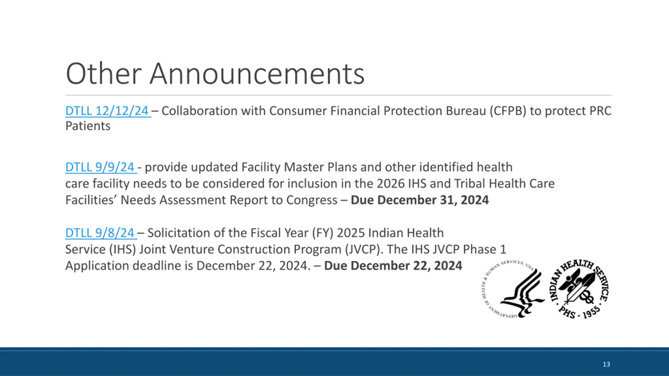 Other Announcements DTLL 12/12/24 Collaboration with Consumer Financial Protection Bureau (CFPB) to protect PRC Patients DTLL 9/9/24 - provide updated Facility Master Plans and other identified health care facility needs to be considered for inclusion in the 2026 IHS and Tribal Health Care Facilities Needs Assessment Report to Congress Due December 31, 2024 DTLL 9/8/24 Solicitation of the Fiscal Year (FY) 2025 Indian Health Service (IHS) Joint Venture Construction Program (JVCP). The IHS JVCP Phase 1 Application deadline is December 22, 2024. Due December 22, 2024 13