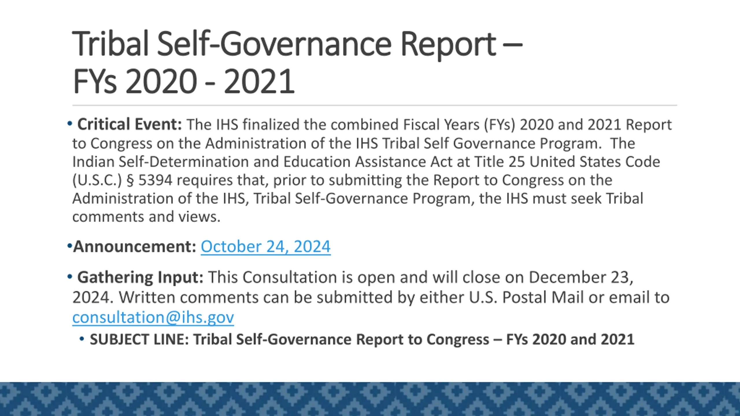 Tribal Self Tribal Self- -Governance Report Governance Report FYs 2020 FYs 2020 - - 2021 2021 Critical Event: The IHS finalized the combined Fiscal Years (FYs) 2020 and 2021 Report to Congress on the Administration of the IHS Tribal Self Governance Program. The Indian Self-Determination and Education Assistance Act at Title 25 United States Code (U.S.C.) 5394 requires that, prior to submitting the Report to Congress on the Administration of the IHS, Tribal Self-Governance Program, the IHS must seek Tribal comments and views. Announcement: October 24, 2024 Gathering Input: This Consultation is open and will close on December 23, 2024. Written comments can be submitted by either U.S. Postal Mail or email to consultation@ihs.gov SUBJECT LINE: Tribal Self-Governance Report to Congress FYs 2020 and 2021 9