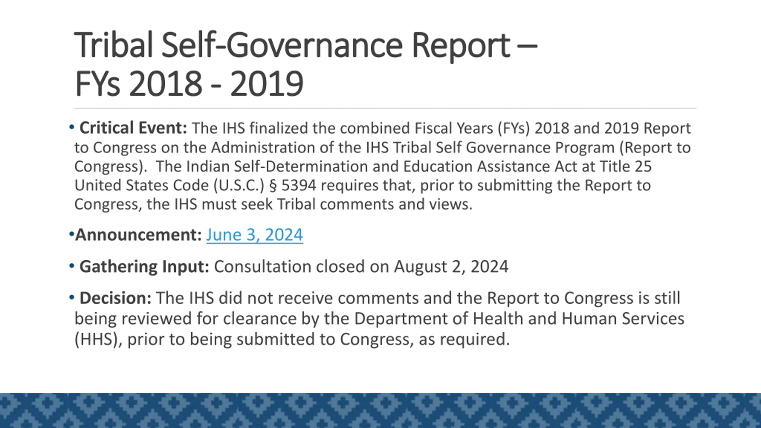 Tribal Self Tribal Self- -Governance Report Governance Report FYs 2018 FYs 2018 - - 2019 2019 Critical Event: The IHS finalized the combined Fiscal Years (FYs) 2018 and 2019 Report to Congress on the Administration of the IHS Tribal Self Governance Program (Report to Congress). The Indian Self-Determination and Education Assistance Act at Title 25 United States Code (U.S.C.) 5394 requires that, prior to submitting the Report to Congress, the IHS must seek Tribal comments and views. Announcement: June 3, 2024 Gathering Input: Consultation closed on August 2, 2024 Decision: The IHS did not receive comments and the Report to Congress is still being reviewed for clearance by the Department of Health and Human Services (HHS), prior to being submitted to Congress, as required. 8