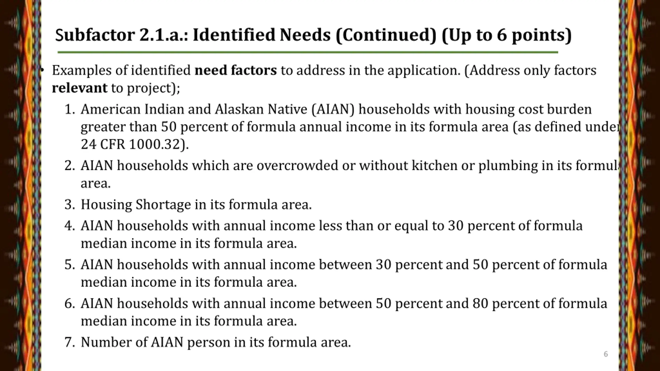 S Subfactor 2.1.a.: Identified Needs (Continued) (Up to 6 points) Examples of identified need factors to address in the application. (Address only factors relevant to project); 1. American Indian and Alaskan Native (AIAN) households with housing cost burden greater than 50 percent of formula annual income in its formula area (as defined under 24 CFR 1000.32). 2. AIAN households which are overcrowded or without kitchen or plumbing in its formula area. 3. Housing Shortage in its formula area. 4. AIAN households with annual income less than or equal to 30 percent of formula median income in its formula area. 5. AIAN households with annual income between 30 percent and 50 percent of formula median income in its formula area. 6. AIAN households with annual income between 50 percent and 80 percent of formula median income in its formula area. 7. Number of AIAN person in its formula area. 6