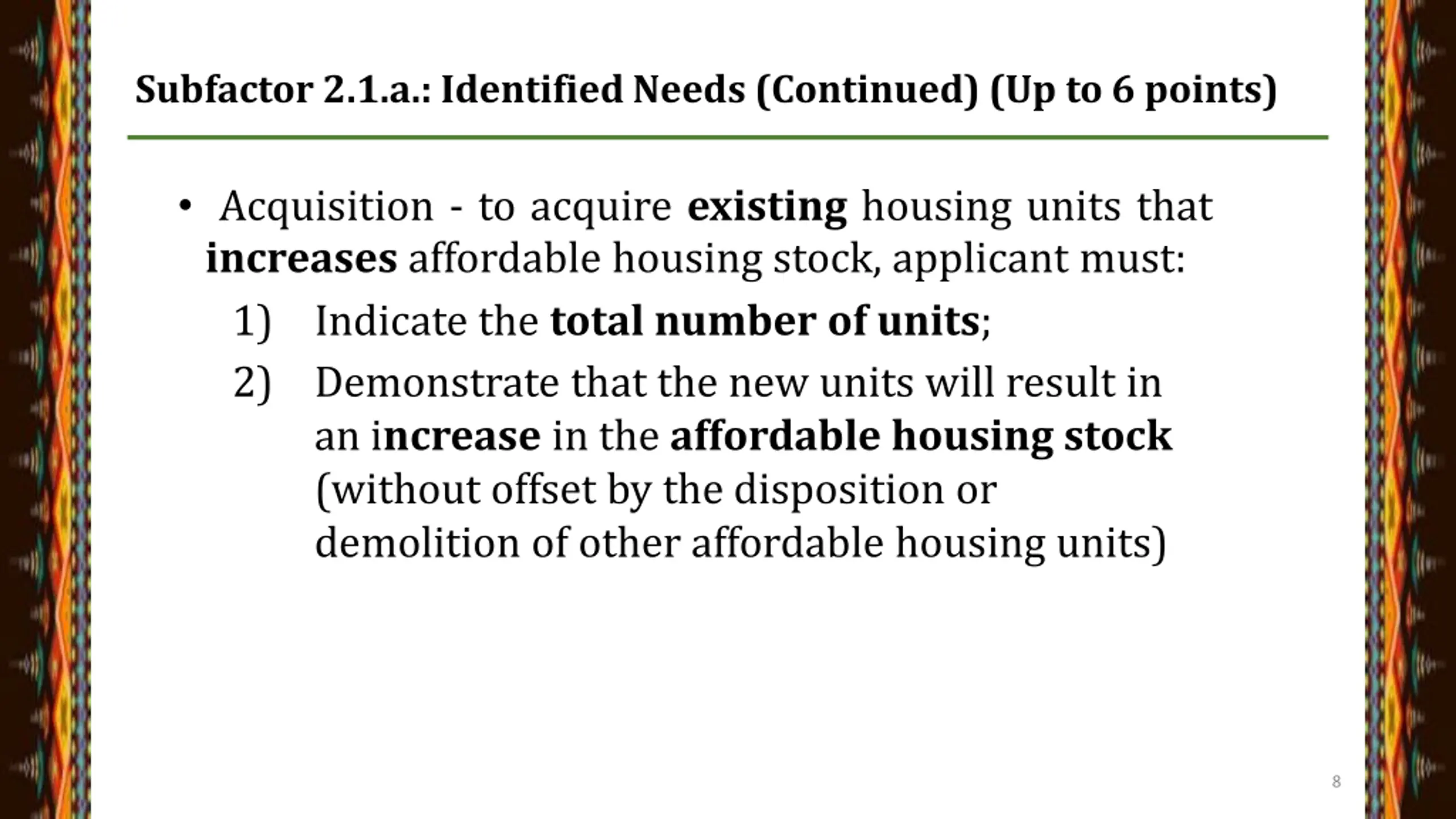 Subfactor 2.1.a.: Identified Needs (Continued) (Up to 6 points) Acquisition - to acquire existing housing units that increases affordable housing stock, applicant must: 1) Indicate the total number of units; 2) Demonstrate that the new units will result in an increase in the affordable housing stock (without offset by the disposition or demolition of other affordable housing units) 8