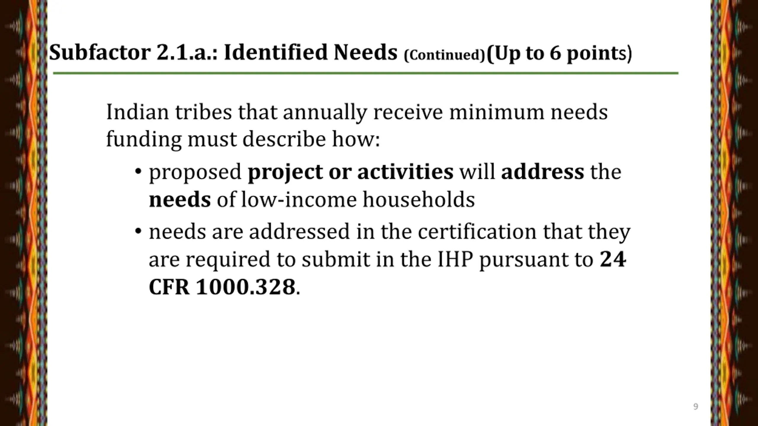 Subfactor 2.1.a.: Identified Needs (Continued)(Up to 6 points) s) Indian tribes that annually receive minimum needs funding must describe how: proposed project or activities will address the needs of low-income households needs are addressed in the certification that they are required to submit in the IHP pursuant to 24 CFR 1000.328. 9