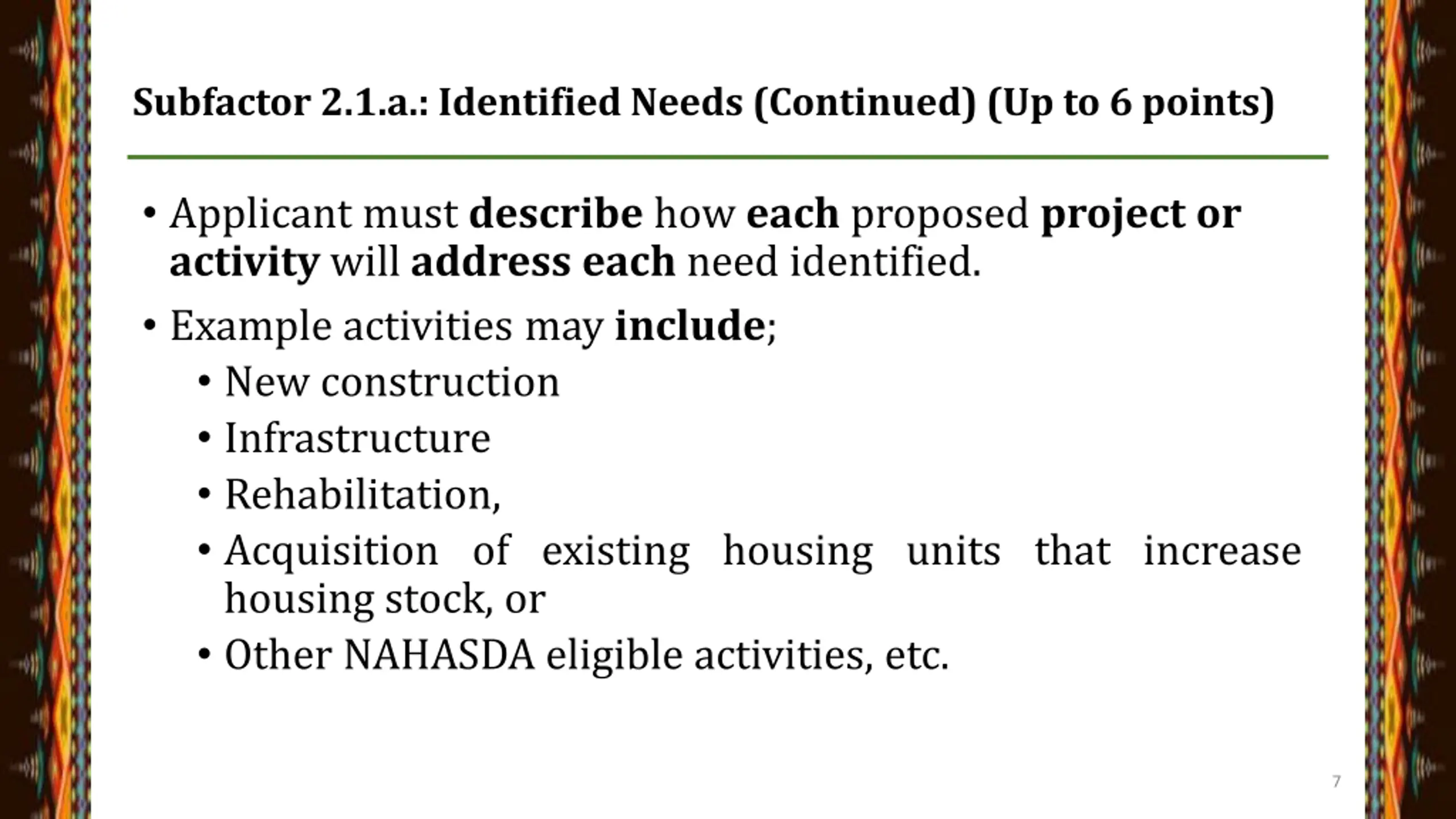 Subfactor 2.1.a.: Identified Needs (Continued) (Up to 6 points) Applicant must describe how each proposed project or activity will address each need identified. Example activities may include; New construction Infrastructure Rehabilitation, Acquisition of existing housing units that increase housing stock, or Other NAHASDA eligible activities, etc. 7
