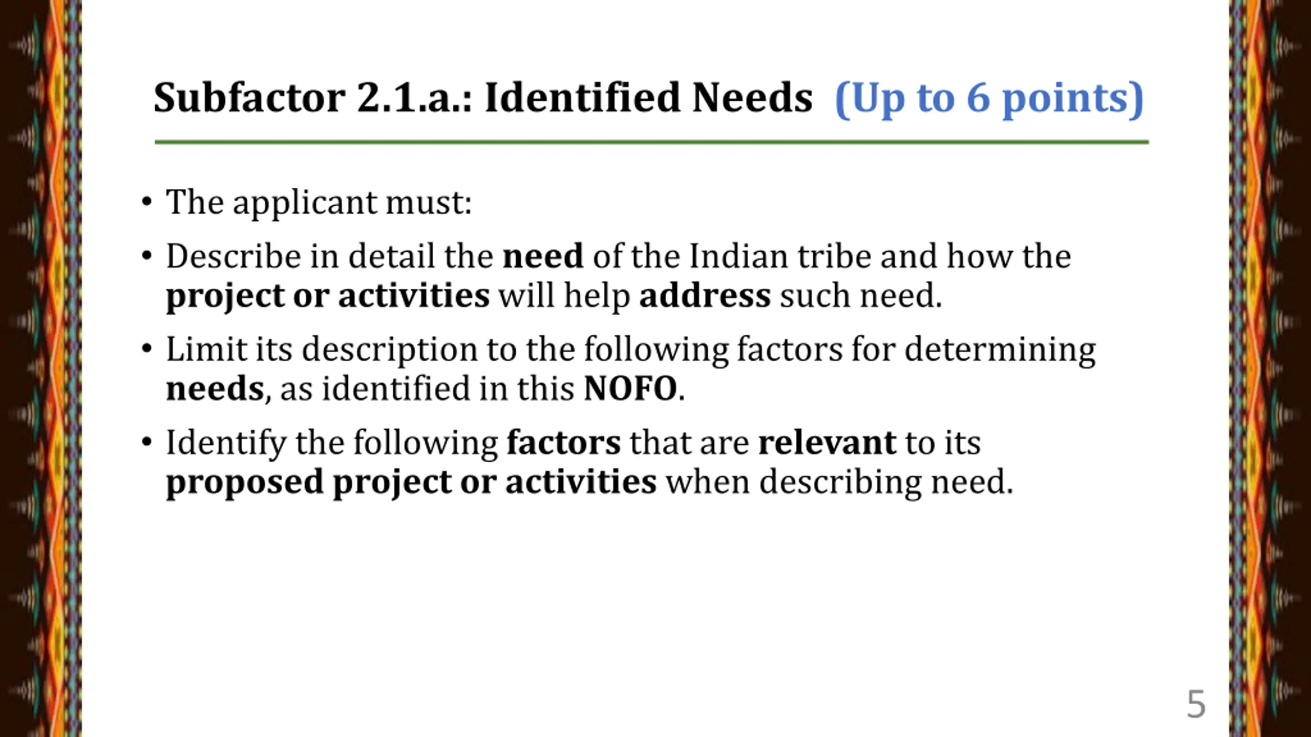 Subfactor 2.1.a.: Identified Needs (Up to 6 points) The applicant must: Describe in detail the need of the Indian tribe and how the project or activities will help address such need. Limit its description to the following factors for determining needs, as identified in this NOFO. Identify the following factors that are relevant to its proposed project or activities when describing need. 5