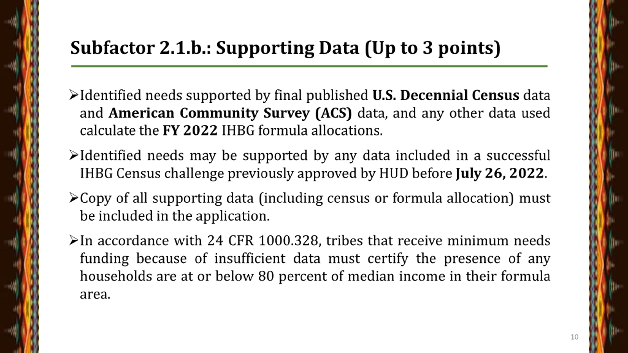 Subfactor 2.1.b.: Supporting Data (Up to 3 points) Identified needs supported by final published U.S. Decennial Census data and American Community Survey (ACS) data, and any other data used calculate the FY 2022 IHBG formula allocations. Identified needs may be supported by any data included in a successful IHBG Census challenge previously approved by HUD before July 26, 2022. Copy of all supporting data (including census or formula allocation) must be included in the application. In accordance with 24 CFR 1000.328, tribes that receive minimum needs funding because of insufficient data must certify the presence of any households are at or below 80 percent of median income in their formula area. 10