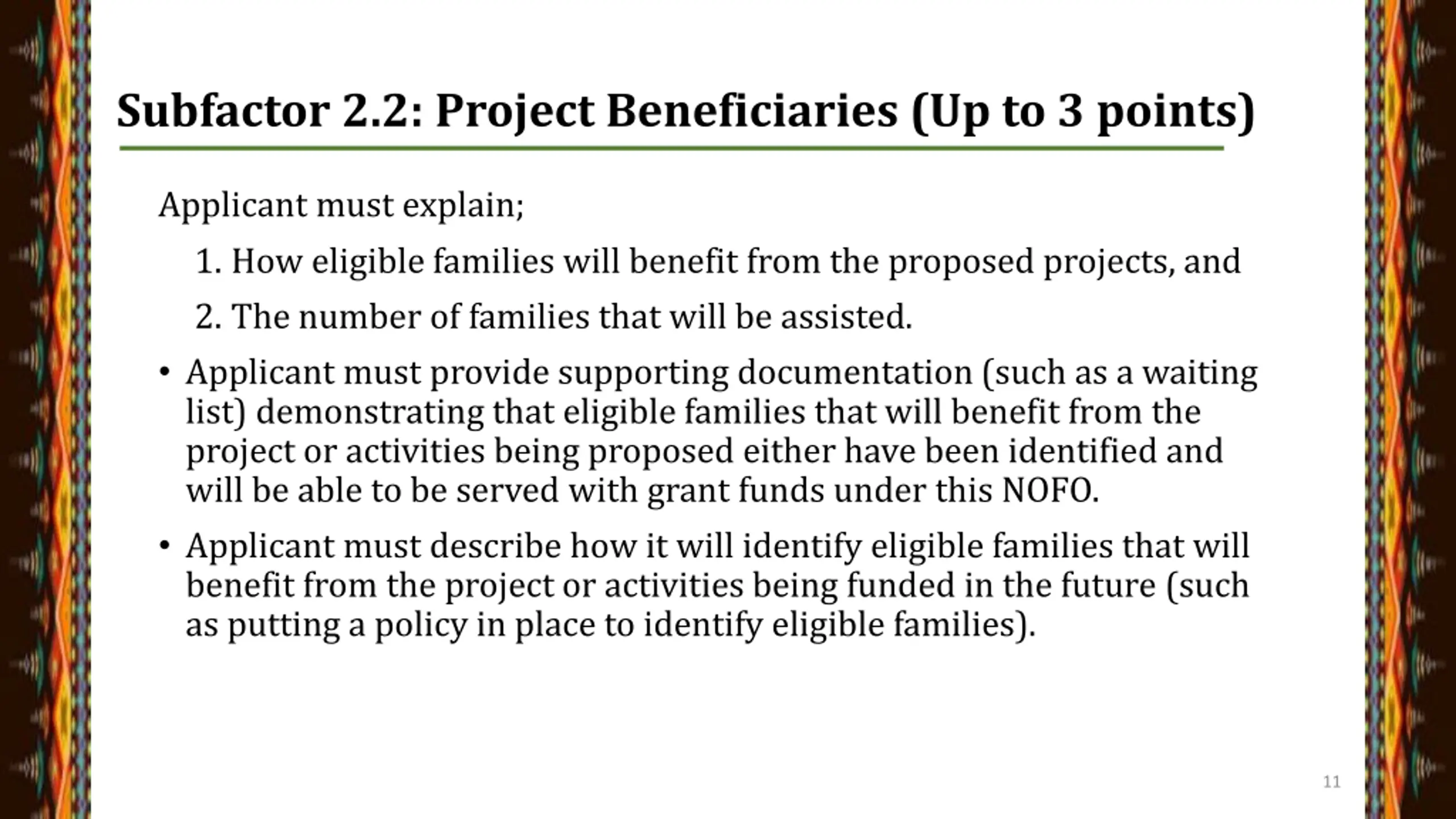 Subfactor 2.2: Project Beneficiaries (Up to 3 points) Applicant must explain; 1. How eligible families will benefit from the proposed projects, and 2. The number of families that will be assisted. Applicant must provide supporting documentation (such as a waiting list) demonstrating that eligible families that will benefit from the project or activities being proposed either have been identified and will be able to be served with grant funds under this NOFO. Applicant must describe how it will identify eligible families that will benefit from the project or activities being funded in the future (such as putting a policy in place to identify eligible families). 11