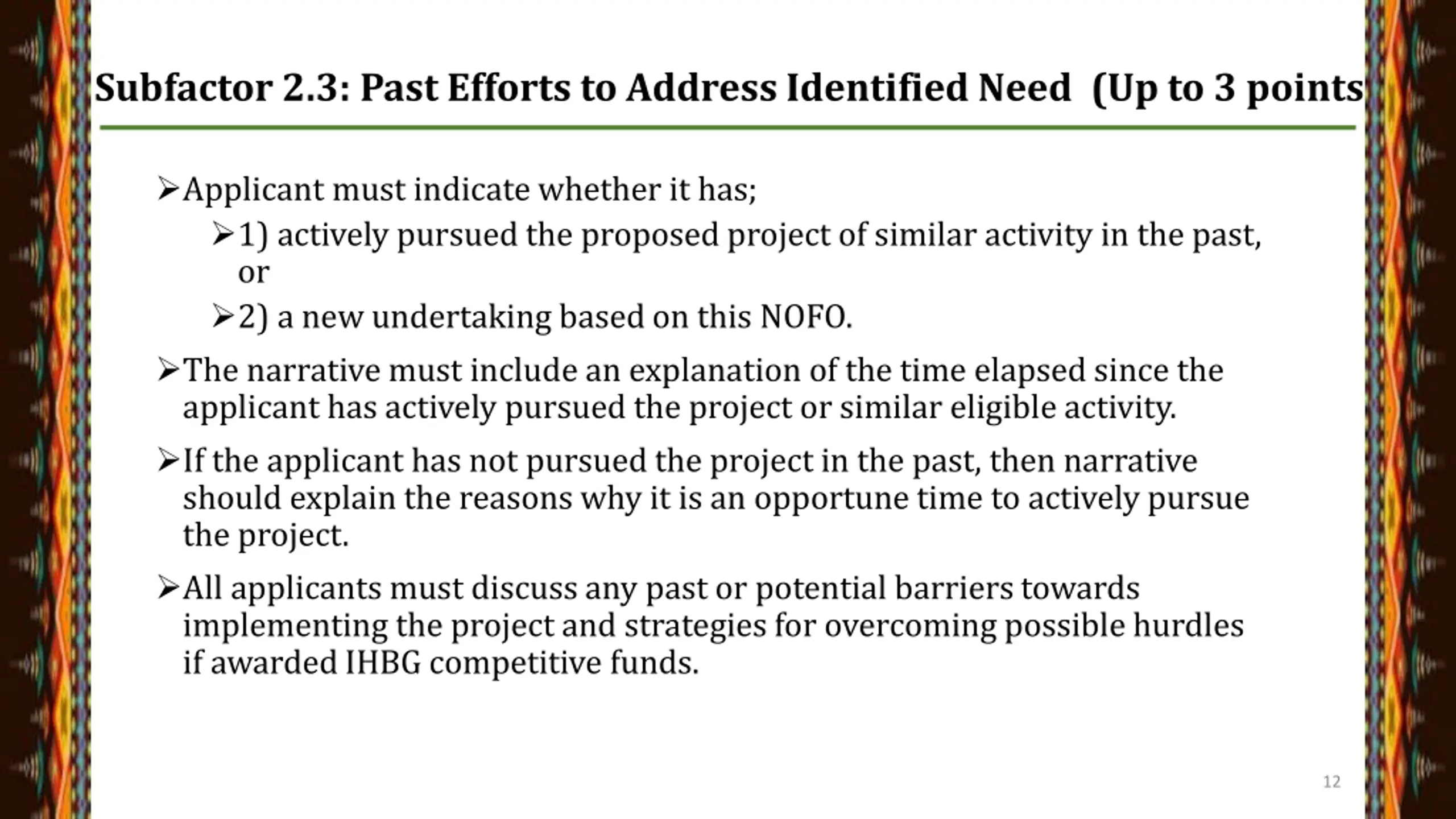 Subfactor 2.3: Past Efforts to Address Identified Need (Up to 3 points) Applicant must indicate whether it has; 1) actively pursued the proposed project of similar activity in the past, or 2) a new undertaking based on this NOFO. The narrative must include an explanation of the time elapsed since the applicant has actively pursued the project or similar eligible activity. If the applicant has not pursued the project in the past, then narrative should explain the reasons why it is an opportune time to actively pursue the project. All applicants must discuss any past or potential barriers towards implementing the project and strategies for overcoming possible hurdles if awarded IHBG competitive funds. 12