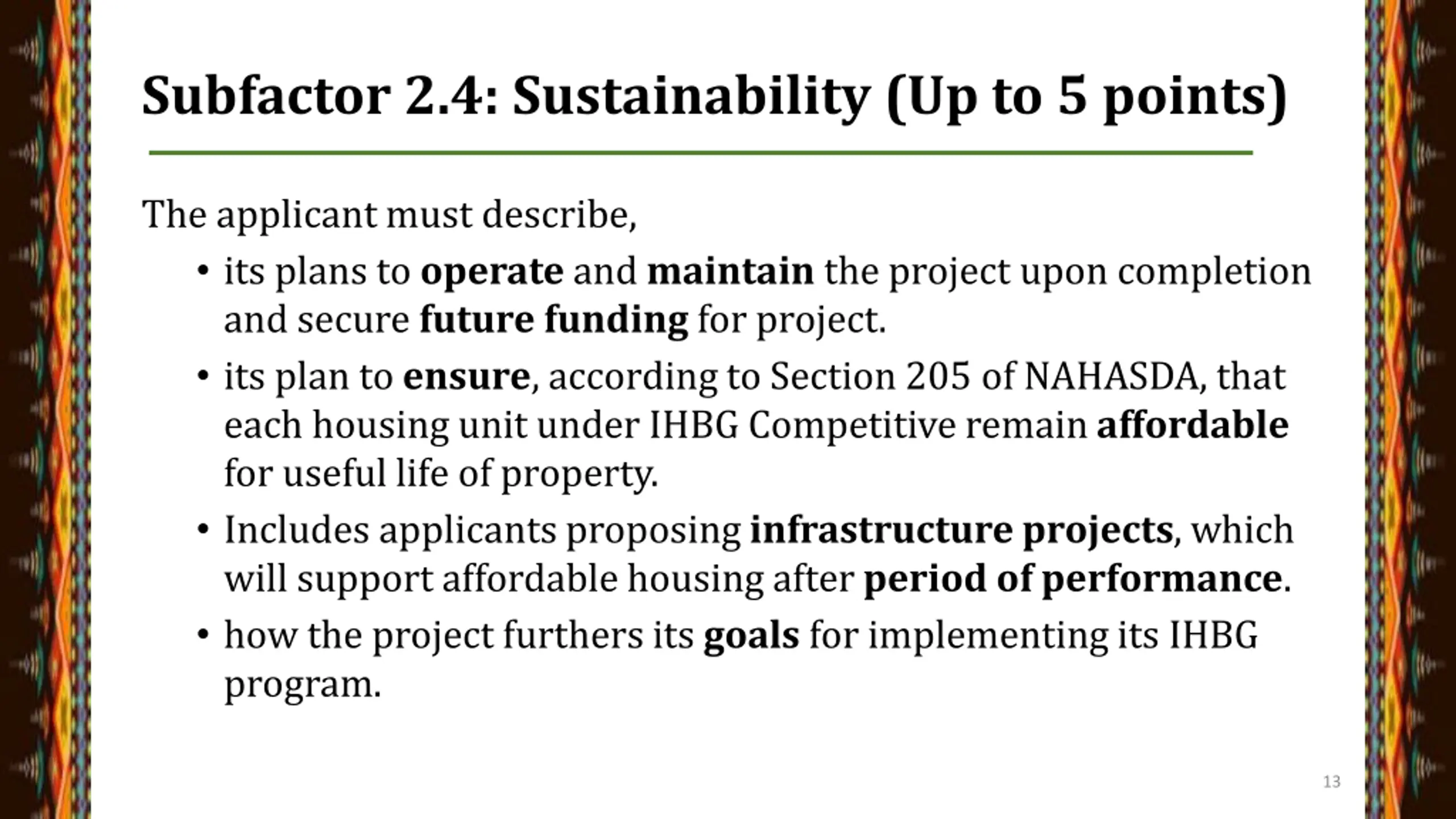 Subfactor 2.4: Sustainability (Up to 5 points) The applicant must describe, its plans to operate and maintain the project upon completion and secure future funding for project. its plan to ensure, according to Section 205 of NAHASDA, that each housing unit under IHBG Competitive remain affordable for useful life of property. Includes applicants proposing infrastructure projects, which will support affordable housing after period of performance. how the project furthers its goals for implementing its IHBG program. 13