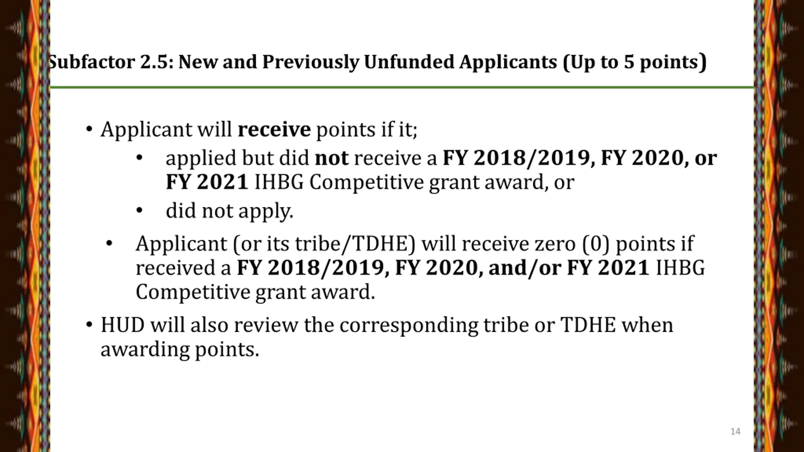 Subfactor 2.5: New and Previously Unfunded Applicants (Up to 5 points) Applicant will receive points if it; applied but did not receive a FY 2018/2019, FY 2020, or FY 2021 IHBG Competitive grant award, or did not apply. Applicant (or its tribe/TDHE) will receive zero (0) points if received a FY 2018/2019,FY 2020, and/or FY 2021 IHBG Competitive grant award. HUD will also review the corresponding tribe or TDHE when awarding points. 14
